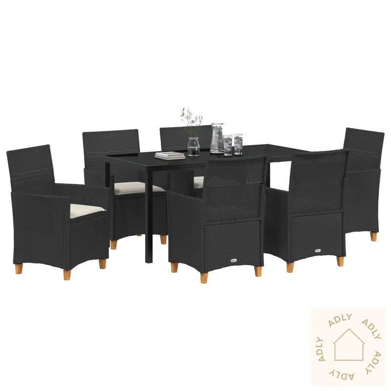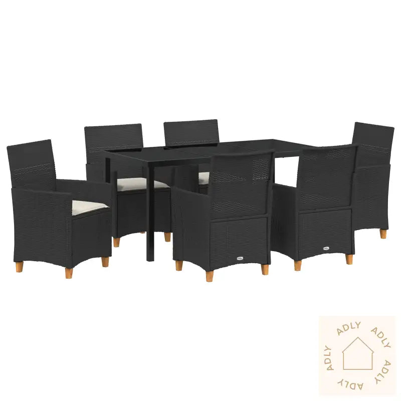 Holdbart materiale: Stolene er laget av værbestandig og høykvalitets poly rotting, noe som gir et naturlig utseende samtidig som de tåler utendørsværet og krevende bruk. Denne typen syntetiske rotting gjør det enkelt å finne vedlikeholdsfrie møbler til hjemmet og hagen, og de holder på utseendet lenge.Komfortable seter: Alle stolene leveres med tykke, polstrede puter som gir en behagelig sitteopplevelse hele dagen. Putene gir støttende komfort både for deg og gjestene dine, uansett om dere nyter en kopp kaffe eller et langt måltid utendørs.Robust ramme: Den solide, pulverlakkerte stålrammen gir ekstra styrke og stabilitet, og tåler daglig bruk uten problemer. Produktene er konstruert for å vare i mange sesonger og holder seg stabile og fine, selv med mye bruk.Lett vedlikehold: Puteovertrekkene kan tas av og vaskes, noe som gjør det enkelt å holde dine hagemøbler friske og rene sesong etter sesong. Møblene er konstruert for å være praktiske og lette å ta vare på, perfekt for en travel hverdag.Antall varer: 7Farge: SvartForm: RektangulærMateriale: Syntetisk poly rottingFinish: PulverlakkertInnendørs/Ute: Innendørs / UtendørsTrekk inkludert: NeiRom: Hage og terrasseBatterier inkludert: NeiHodestøtte inkludert: NeiMaksimalt antall personer: 6Maksimal vekt: 110 kgOverflatehøyde: 90 cmBen høyde: 25 cmSitte dybde: 46 cmSittekapasitet: 6Gynge: NeiStige: NeiMerke: Levering inneholder: 6 x hagestol, 1 x hagebordMontering kreves: JaAnbefalt antall personer for montering: 2