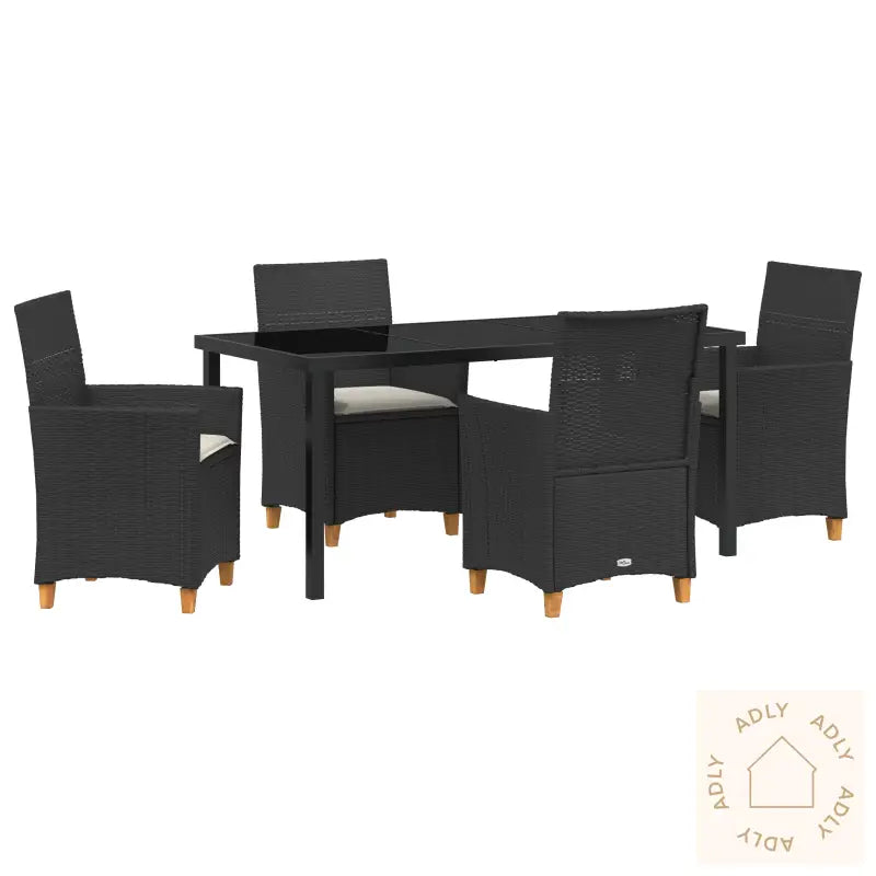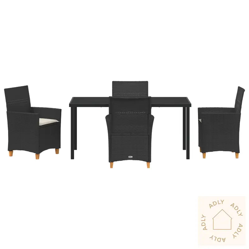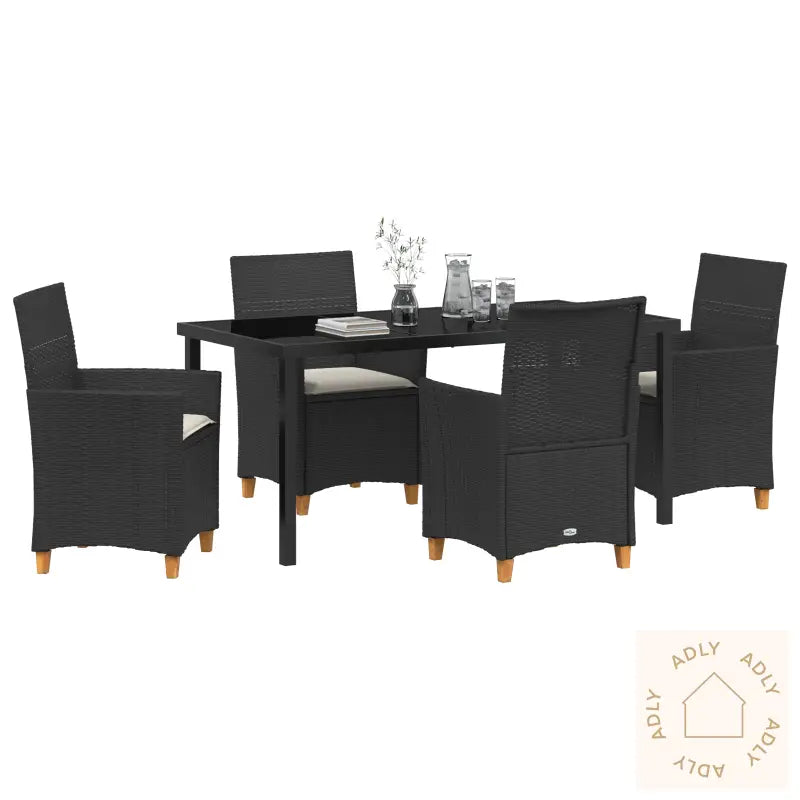 Antall deler: 5Farge: SvartForm: RektangulærMateriale: Syntetisk polyrottingFinish: PulverlakkertBruk: Innendørs/UtendørsTrekk inkludert: NeiRom: Hage og terrasseBatterier inkludert: NeiHodegjerde inkludert: NeiKapasitet: Perfekt for utendørs serveringMakspersoner: 4Maks vekt: 110 kgBenhøyde: 45 cmSetedybde: 46 cmSittekapasitet: 4Vugger: NeiStige: NeiMerke: vidaXLLeveransen inneholder: 4 x hagestol, 1 x hagebordMontering nødvendig: JaAnbefalt antall personer for montering: 2