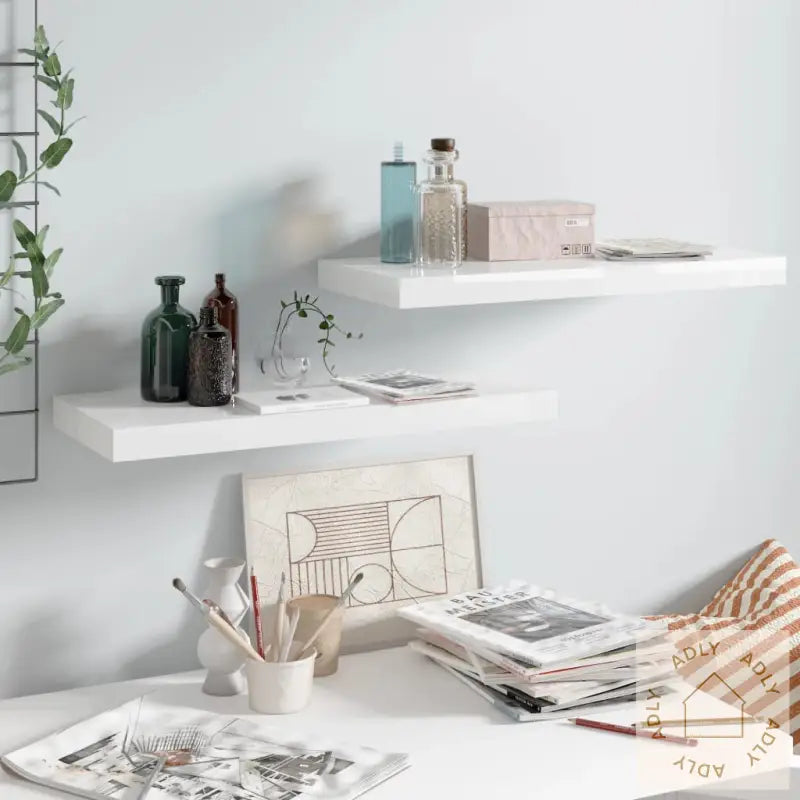 Hver hylle er laget av holdbar MDF med høyglans hvit finish i kombinasjon med en robust metallramme. Dette gir god stabilitet og sørger for langvarig bruk, uansett om du trenger ekstra plass til interiør eller ønsker et spennende designelement. Vegghyllene har et tidløst uttrykk som kler de fleste stiler og kan enkelt kombineres med andre møbler til hjemmet for å skape en personlig atmosfære. Hvis du er ute etter funksjonelle og stilrene vegghyller med usynlig monteringssystem, vil disse gi deg flere muligheter til å løfte både innredning og oppbevaring.