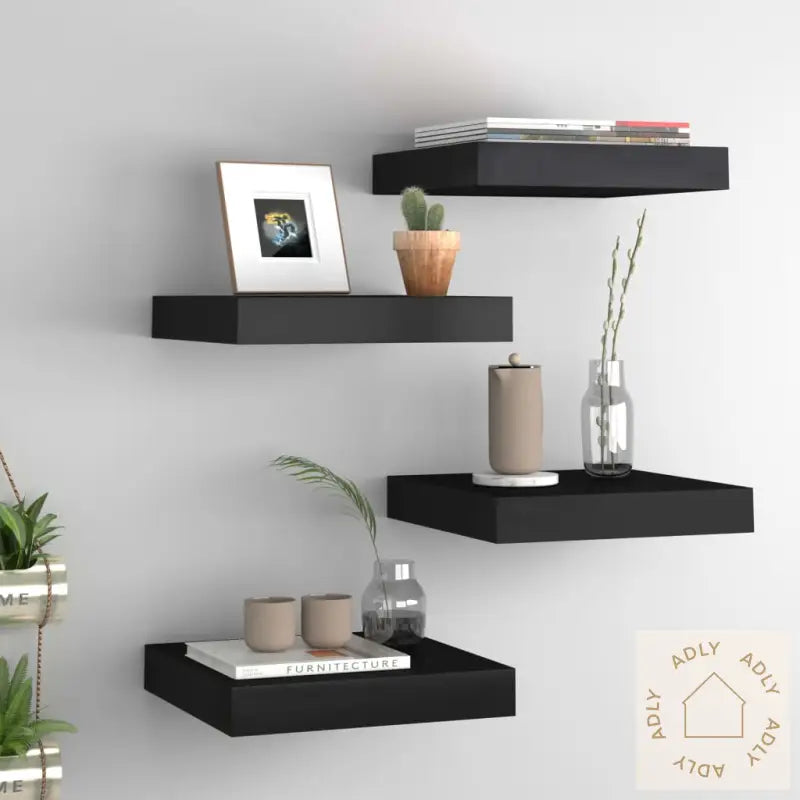 Farge: svartMaterialer: bikake MDF, metallMål: 23 x 23,5 x 3,8 cm (L x B x H)Maksimal lastekapasitet (hver): 5 kgUsynlig monteringssystemMontering kreves: jaLeveransen inneholder:4 x vegghyller