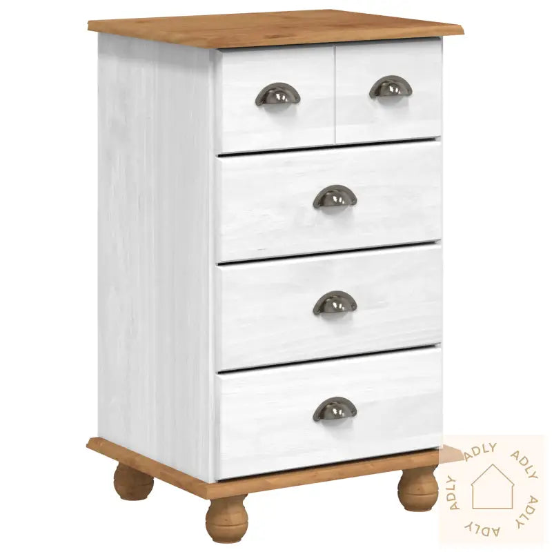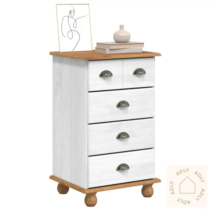 Kvalitetsmateriale: Denne kommoden er laget av solid tre som tåler daglig bruk og slitasje. Du får et møbel som varer lenge, noe som gir mye verdi for pengene.Moderne design: Den elegante profilen og de stilrene linjene passer inn i mange interiørstiler, fra klassisk til moderne. Den matte hvite finishen gjør kommoden enkel å matche med andre møbler og gir et tidløst preg.God lagringsplass: Fire romslige skuffer gir deg nok plass til klær, tilbehør eller småting, så du enkelt kan holde både soverom og stue ryddig og organisert.Stødig konstruksjon: Kommoden har robuste klumpføtter som sørger for stabilitet selv når du fyller skuffene opp, uten at det går utover det stilfulle utseendet.Matt finish: Overflatene er ikke-reflekterende og enkle å holde rene – tørk bare av med en tørr klut for å bevare utseendet. Perfekt for deg som vil ha praktiske møbler.Farge: Hvit Form: RektangulærFinish: MattInnendørs/Ute: Kun innendørsCover included: NeiRom: SoveromBatterier inkludert: NeiOverflatehøyde: 2,0 cmBein høyde: 10,0 cmLadder: NeiMerke: Leveransen inneholder: KommodeMontering nødvendig: JaAnbefalt antall personer for montering: 2