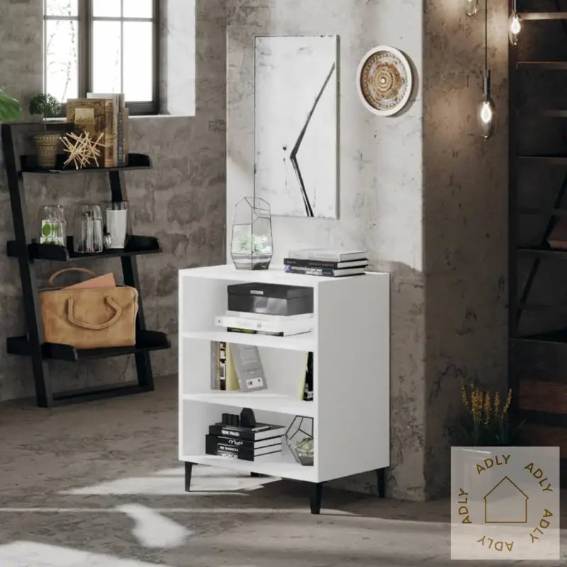 Skjenken er laget av solid sponplate som gir god stabilitet, holdbarhet og lang levetid. De robuste metallbeina styrker konstruksjonen og gjør at møbelet står stødig, uansett bruk. Med 3 praktiske hyller får du rikelig med lagringsplass til bøker, serviser eller ting du ikke vil ha liggende fremme, noe som bidrar til et ryddigere hjem. Den store, flate bordplaten gir deg en fin plass til å vise frem alt fra personlige bilderammer til dekor eller grønne planter, slik at du enkelt kan sette ditt personlige preg på rommet.