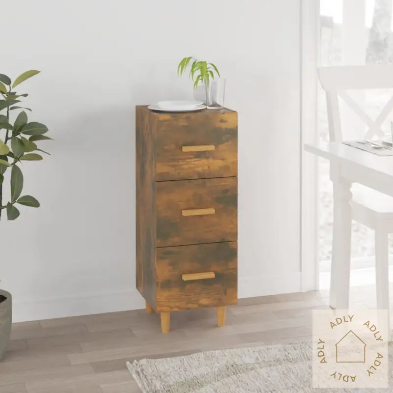 Solid materiale: Skapet er produsert i konstruert tre med høy kvalitet, noe som gir en glatt overflate og sørger for styrke og stabilitet. Materialet motstår fuktighet, og er samtidig veldig lett å vedlikeholde – du trenger bare en enkel tørk for å holde det rent. Her får du møbler som varer lenge og tåler daglig bruk.Rikelig med lagringsplass: Med tre store skuffer får du rikelig plass til å organisere alt fra småting til papirer og tilbehør. Det gir deg god oversikt og hjelper til å holde hjemmet ryddig og innbydende. Perfekt om du er ute etter smartere løsninger for orden og effektivitet.Treføtter: De solide føttene i heltre eukalyptus gir et naturlig og lunt preg som gjør at denne skjenken kan kombineres med mange ulike typer møbler, bokhyller og stående hyller. Samtidig sørger treføttene for at møbelet står stødig på gulvet.Advarsel: