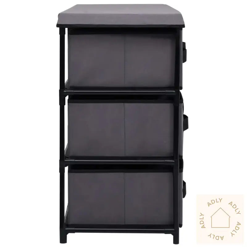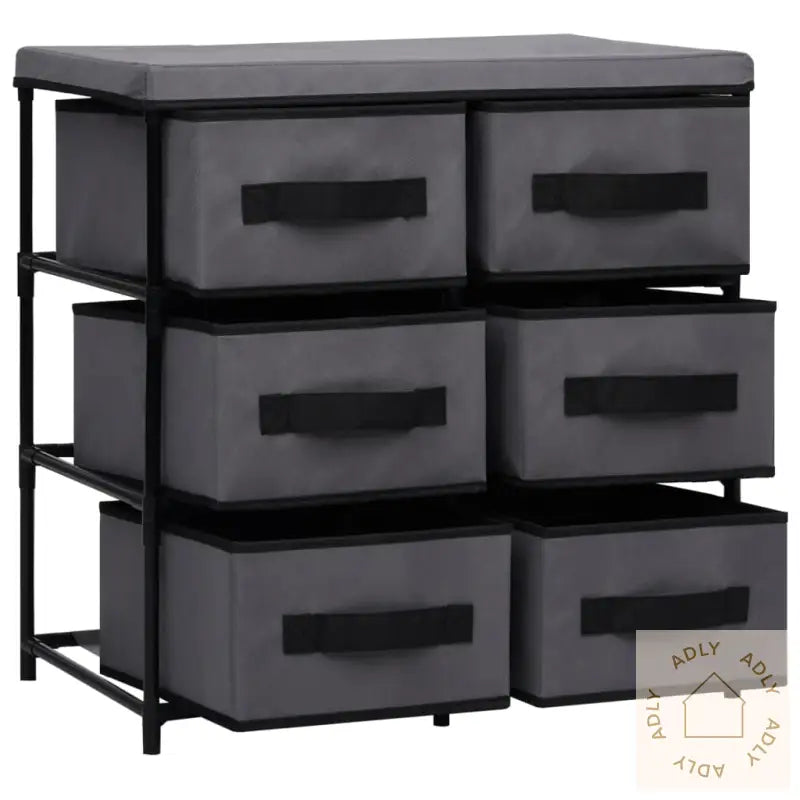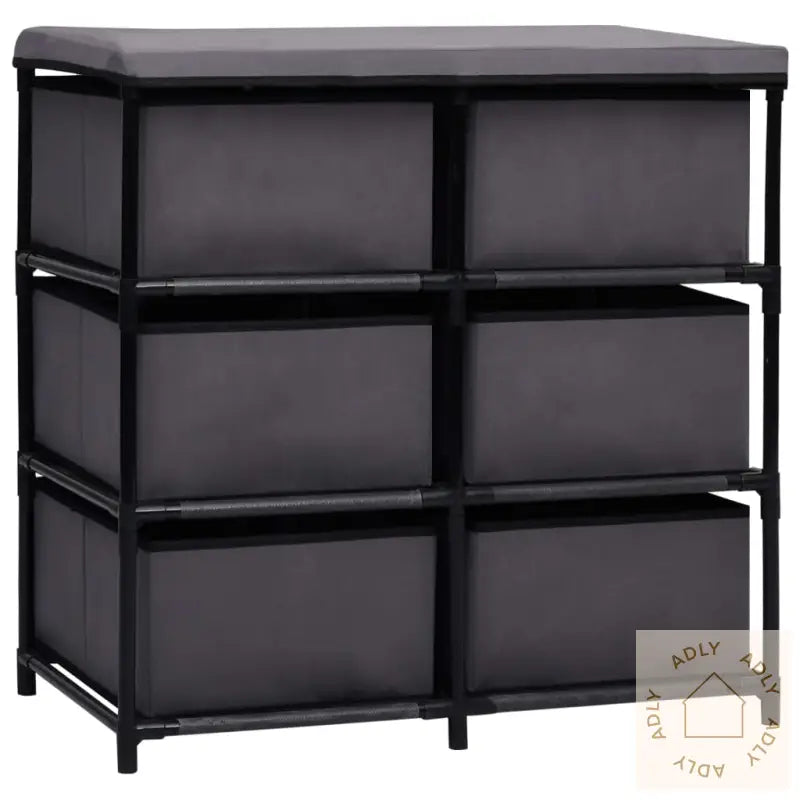 Farge: gråMaterialer: stål og stoffSamlet mål: 55 x 29 x 55 cm (B x D x H)Mål hver skuff: 28 x 25 x 15 cm (L x B x H)Med 6 skufferMaks. lastekapasitet (totalt): 5 kgMaks. lastekapasitet per hylle: 2,5 kgMontering kreves: ja