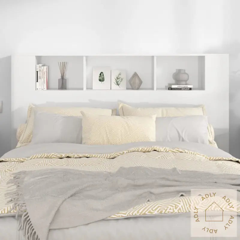 Premium materiale: Det solide, konstruerte treverket har en glatt, høyglans hvit finish. Dette gir skapet et moderne uttrykk samtidig som det sørger for styrke, stabilitet og lang levetid. Materialet motstår fuktighet og holder seg flott over tid – et smart valg blant møbler.Ekstra oppbevaring: Med fem åpne rom på toppen får du plass til både favorittbøker, dekorasjoner og småting du vil ha tilgjengelig. Denne løsningen gjør hodegavlen til en funksjonell bokhylle og gir deg bedre organisering og struktur, akkurat som du får med andre bokhyller og stående hyller.Moderne design: Sengegavlskapet har en enkel, moderne stil som sømløst kombinerer funksjon og estetikk. Denne praktiske løsningen løfter helhetsinntrykket på soverommet og gir rommet et friskt og ryddig preg med møbler til hjemmet som setter komfort først.Advarsel: