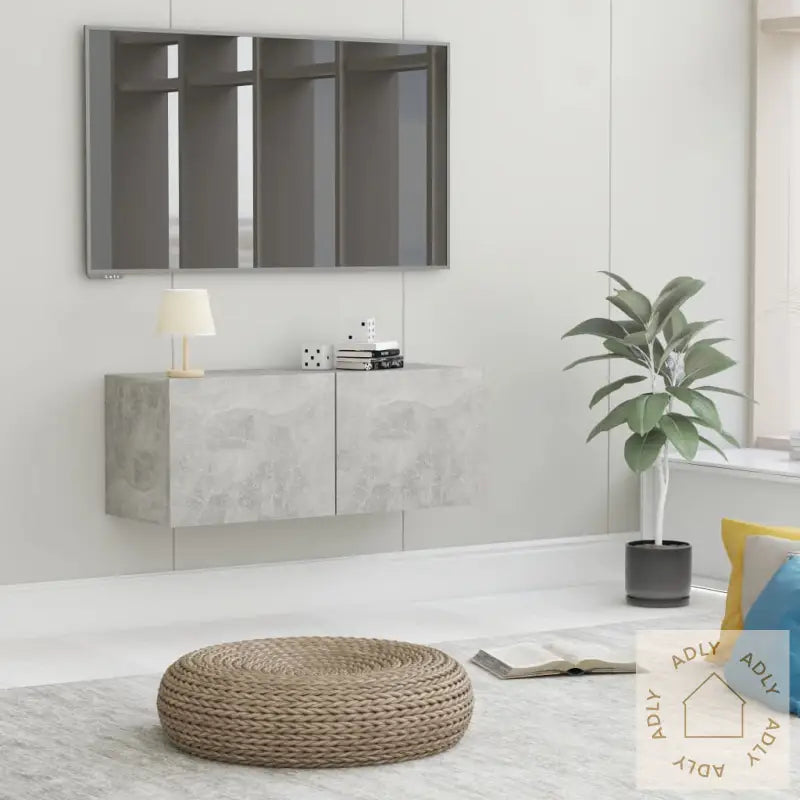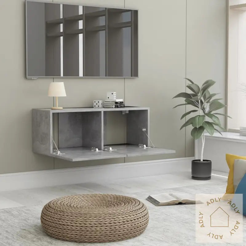 Farge: betonggråMateriale: konstruert treMål: 80 x 30 x 30 cm (B x D x H)Inkluderer to nedtrekkbare dørerMaksimal lastekapasitet (totalt): 60 kgMontering kreves: ja