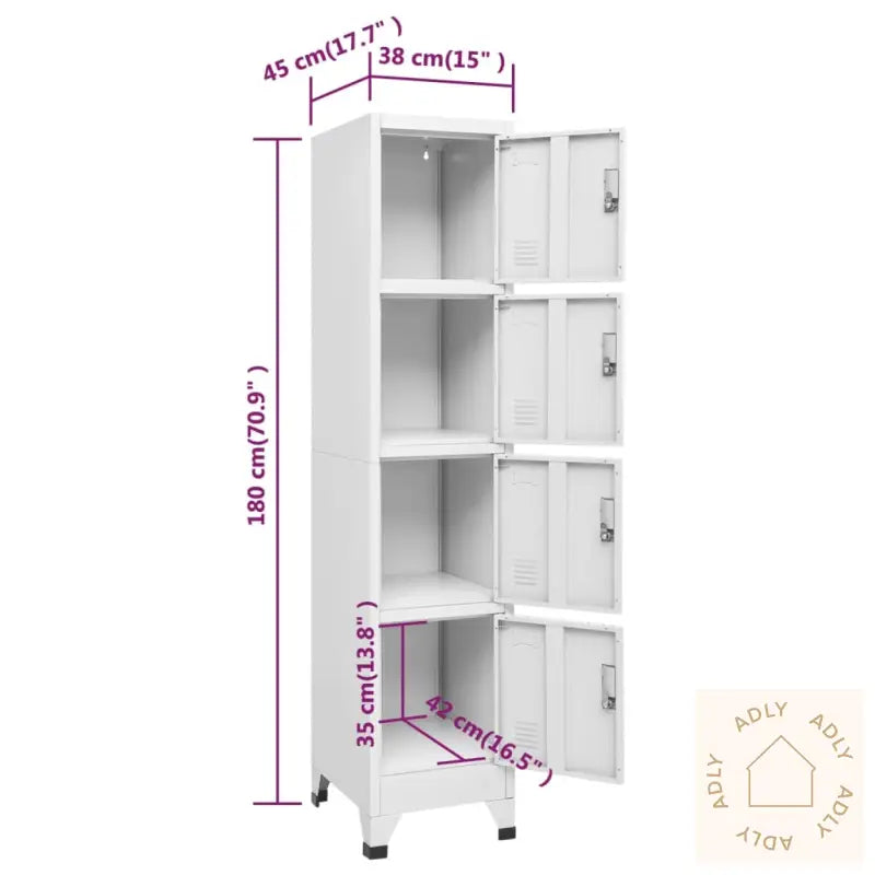 Farge: gråMateriale: robust stål for langvarig brukMål: 38 x 45 x 180 cm (B x D x H), formet for å ta lite gulvplass, men samtidig gi rikelig lagringskapasitetHvert rom har navnekortholder – praktisk om flere bruker samme garderobeskapFire separate låsbare dører, inkludert to nøkler per dør, gir bedre sikkerhet for dine eiendelerBalansert ventilasjon via ventilasjonshull forhindrer fukt og dårlig luktLastekapasitet per hylle: 25 kg, total kapasitet: 70 kg – passer like godt til klær som til tyngre oppbevaringSvært enkel montering – skapet kan settes opp raskt uten behov for spesialverktøyADVARSEL: Produktet må festes med medfølgende festeanordning for å unngå veltingLegal Documents: