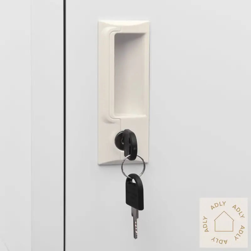 Garderobeskapet har fire separate rom, hver med låsbar dør og egen navnekortholder, så alle eiendeler forblir beskyttet og ryddig organisert. Dette gir god plass til å lagre klær, vesker eller andre personlige ting trygt vekk. Hvert rom gir fleksibilitet, spesielt dersom flere deler skapet, og navnekortholderne gjør det enkelt å holde orden på hva som er ditt.