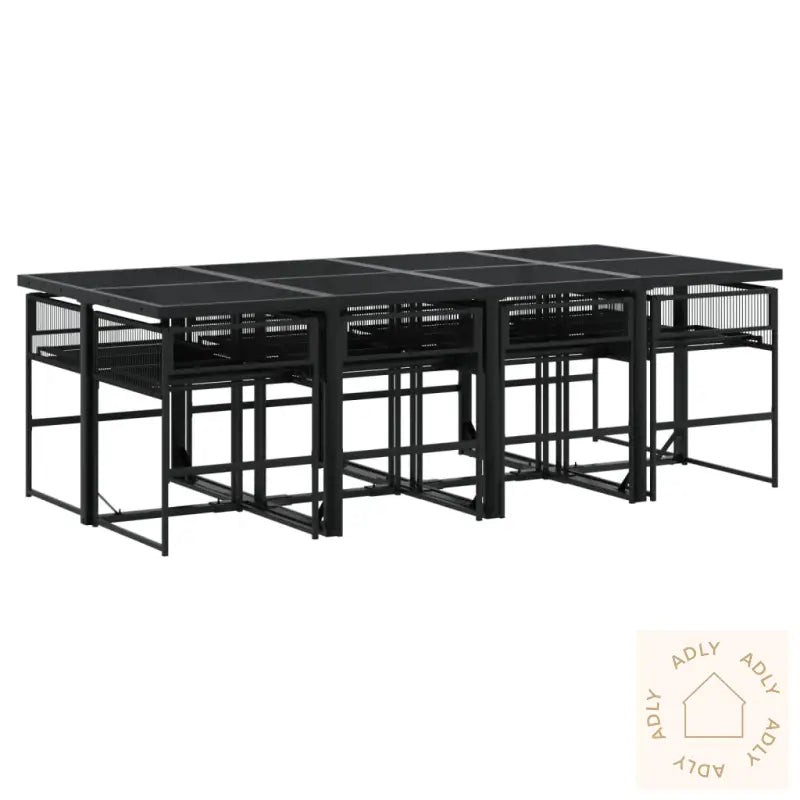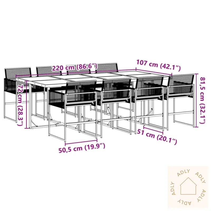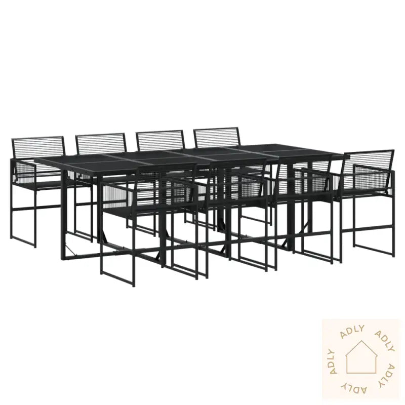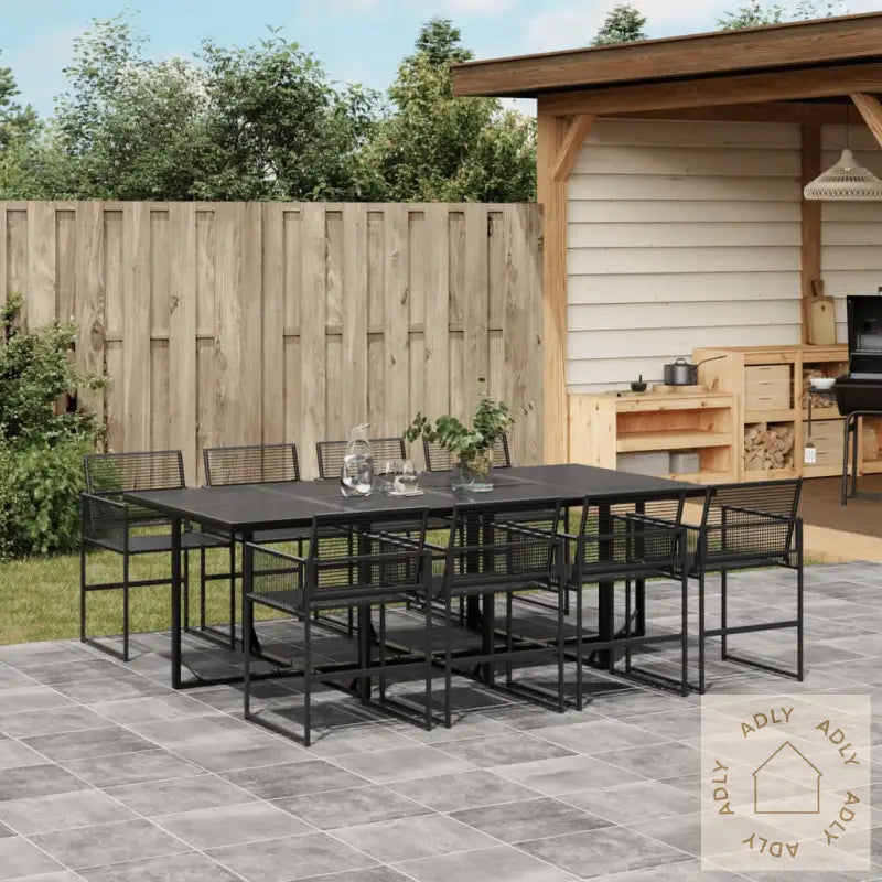 For å bevare møblene til hjemmet og sikre at de svarte materialene holder seg flotte gjennom sesongen, anbefaler vi å bruke et vanntett trekk når møblene ikke er i bruk.Maksimal lastekapasitet (per sete): 110 kgUV-bestandige materialer beskytter mot solbleking og slitasjeMontering kreves: jaBord:Farge: svartMaterialer: PE-rotting, pulverlakkert stål, glassMål: 220 x 107 x 72 cm (L x B x H)Stol:Farge: svartMaterialer: PE-rotting, pulverlakkert stålMål: 50,5 x 51 x 81,5 cm (B x D x H)Mål sete: 47 x 38 cm (B x D)Høyde sete fra bakken: 44 cmHøyde armlene fra bakken: 65 cmLeveransen inneholder:1 x hagebord8 x hagestoler