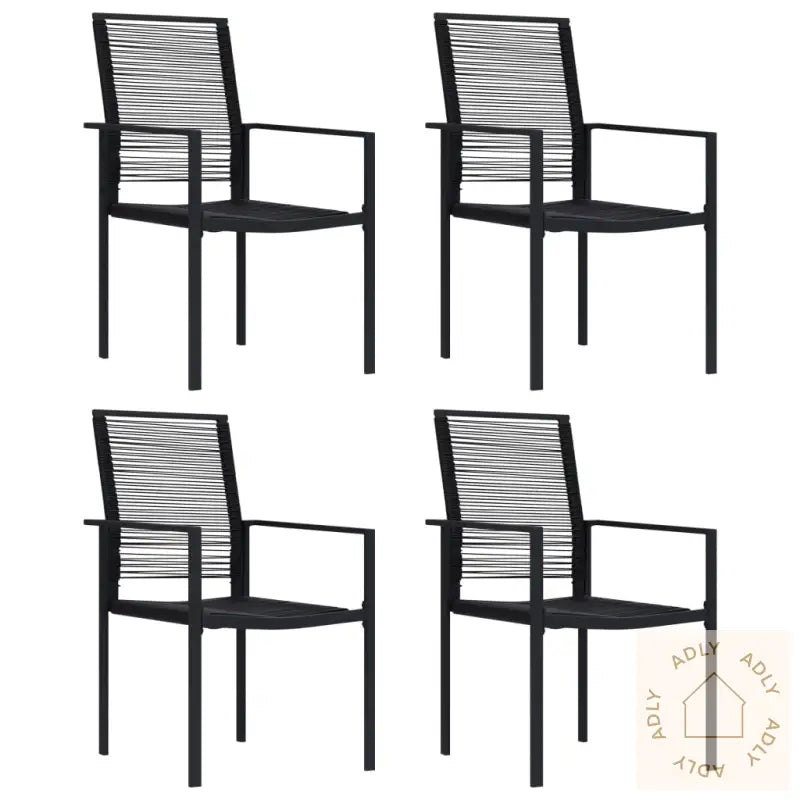 Bord:Farge: svartMaterialer: glass, pulverlakkert stålSamlet mål: 150 x 80 x 74 cm (L x B x H)Spisse stålben gir et moderne pregStol:Farge: svartMaterialer: PVC-hulrotting, kraftig belagt stålMål: 60 x 55 x 90 cm (L x B x H)Lengde armlene: 51 cmBredde sete: 43 cmDybde sete: 50 cmMontering kreves: jaLeveransen inneholder:1 x bord4 x stoler