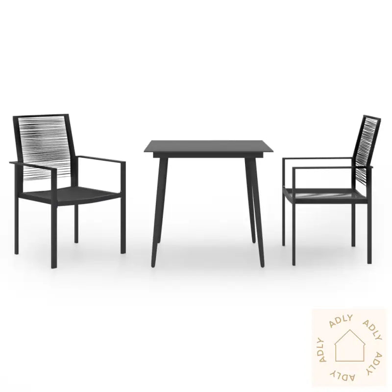 Bord:Farge: svartMaterialer: glass, pulverlakkert stålSamlet mål: 80 x 80 x 74 cm (L x B x H)Spisse stålbenStol:Farge: svart Materialer: PVC-hulrotting, kraftig belagt stålMål: 60 x 55 x 90 cm (L x B x H)Lengde armlene: 51 cm Bredde sete: 43 cmDybde sete: 50 cmMontering kreves: jaLeveransen inneholder:1 x bord2 x stoler