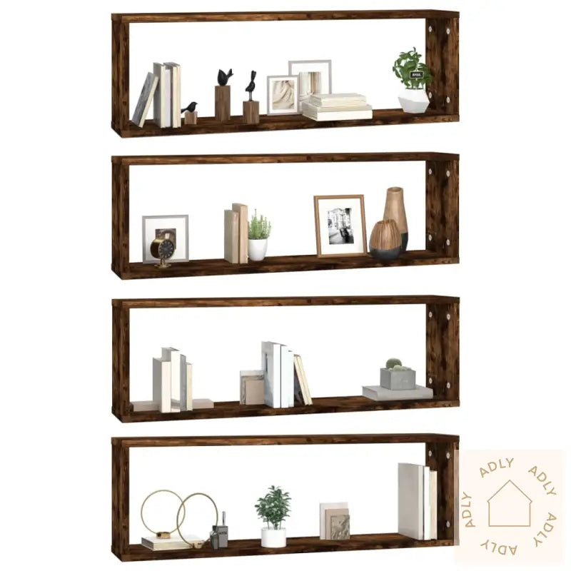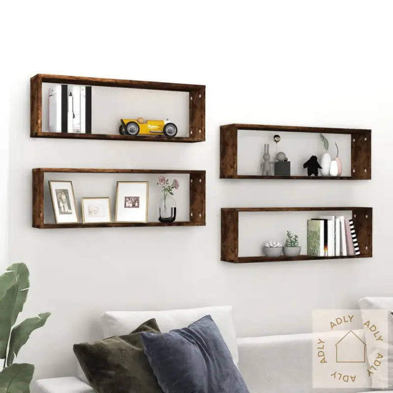 Skrue(r) og plugg(er) for montering på veggen er ikke inkludert. Finn og bruk skruer og plugger som passer til din veggtype. Ved tvil anbefales det å søke profesjonell hjelp. Les instruksjonene nøye for sikker og korrekt montering.Hver pakke inneholder en monteringsveiledning som gjør det enkelt å sette sammen kubehyllene, så du raskt får praktisk oppbevaring på plass.Farge: Røkt eikMateriale: Konstruert treMål: 80 x 15 x 26,5 cm (B x D x H)Leveransen inneholder:4 x kubehyller til vegg