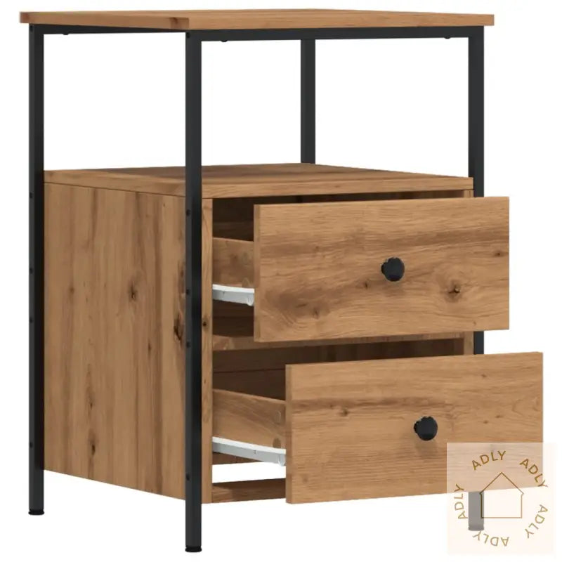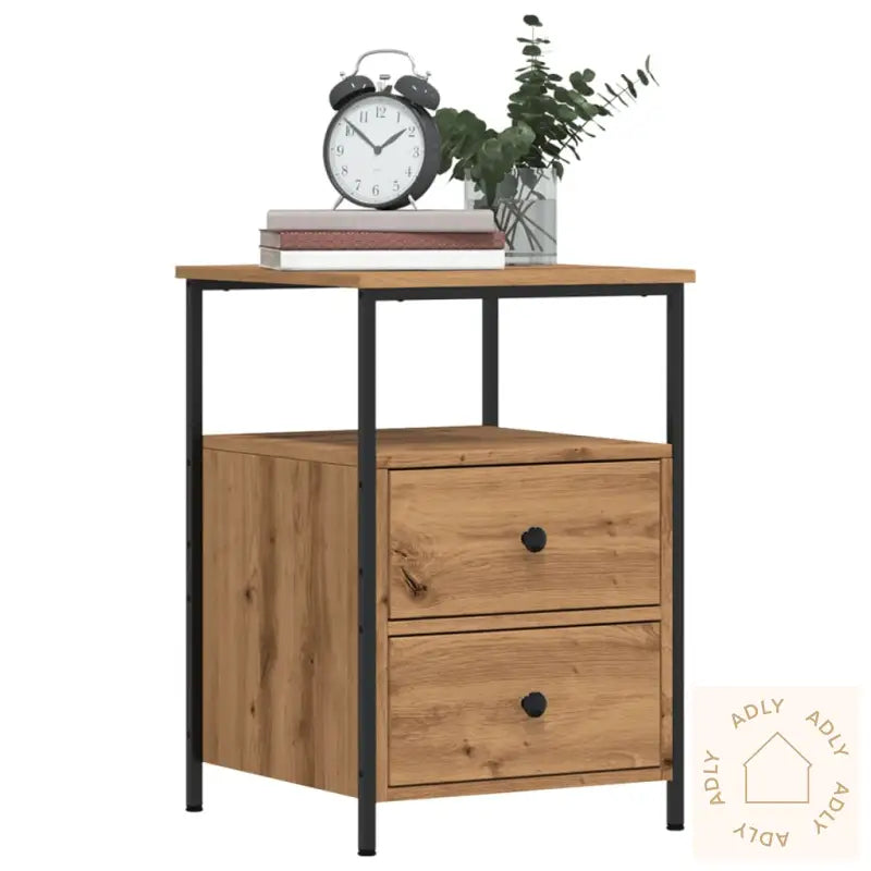 Slitesterkt materiale: Nattbordene er laget av konstruert tre av høy kvalitet med en jevn og fin overflate, som gir ekstra styrke, stabilitet og beskytter mot fuktighet. Det gjør dem robuste for daglig bruk, samtidig som de er enkle å rengjøre med en fuktig klut – praktisk for en travel hverdag.Rikelig med lagringsplass: Med 2 romslige skuffer og ett åpent rom får du god plass til å holde orden på alt fra bøker, magasiner og fjernkontroller til småting du vil ha lett tilgjengelig ved sengen. Dette hjelper deg å holde soverommet ryddig og organisert.Solid topp: Overflaten på nattbordet er perfekt for å vise frem dine favorittdekorasjoner, fotorammer eller grønne planter. Toppen tåler både vekten av en bordlampe og dekorative gjenstander.Metallben: De solide metallbena gir nattbordene i artisan eik et moderne og elegant preg, og skaper en stilsikker kontrast mot treoverflaten. Metallbena bidrar også til ekstra stabilitet og robusthet.Advarsel: