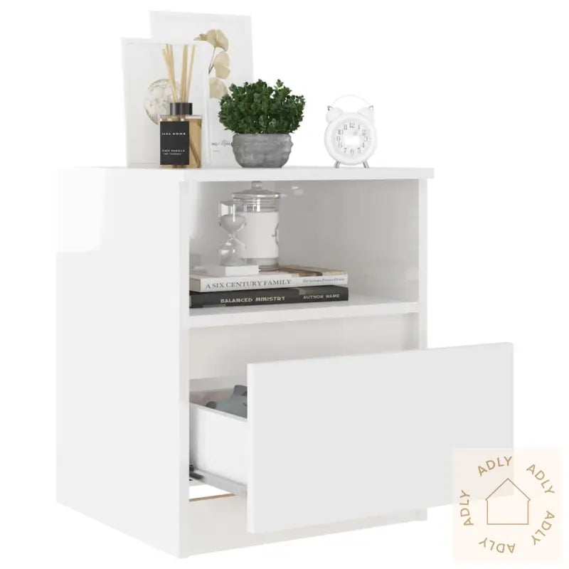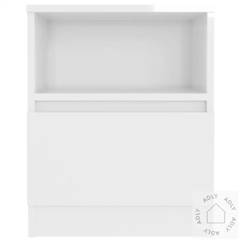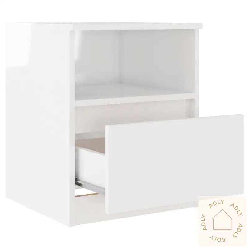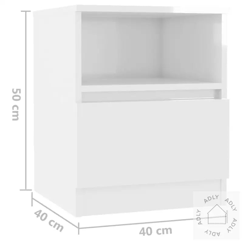 Konstruksjonen er robust, laget i konstruert tre, noe som gir høy slitestyrke over tid. Med en romslig skuff og en åpen hylle kan du enkelt organisere blader, bøker, fjernkontroller og andre småting, slik at alt du trenger alltid er lett tilgjengelig. Dette nattbordet er derfor et smart valg for deg som ønsker en ryddig og funksjonell oppbevaringsløsning på soverommet – eller andre steder i huset hvor du trenger stilige og praktiske møbler. Overflaten i høyglans hvit gir et elegant preg samtidig som den gjør det enkelt å holde nattbordet rent; tørk bare over med en fuktig klut for å friske det opp. Dette produktet er en fin match med både innendørs møbler og kan enkelt kombineres med resten av ditt interiør.