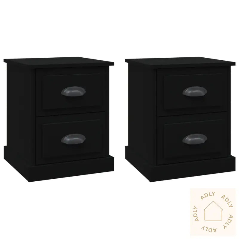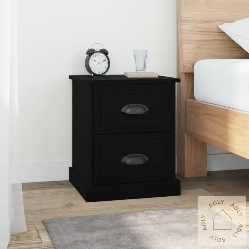 Slitesterkt materiale: De er laget av konstruert treverk av høy kvalitet, med en jevn og pen overflate. Materialet utmerker seg med styrke, stabilitet og god motstand mot fuktighet – det gir deg solide møbler som står seg lenge.Rikelig med oppbevaringsplass: Takket være den praktiske bordplaten og to romslige skuffer kan du ha bøkene dine, fjernkontroller, briller og kaffekoppen lett tilgjengelig. Nattbordene gjør hverdagen enklere ved å hjelpe deg med å holde orden.Multifunksjonelt design: Disse skapene er ikke bare ideelle ved sengen, men passer også godt som sidebord ved sofaen eller som ekstra oppbevaring på kontoret. Du får altså mer enn bare et nattbord – en fleksibel løsning som passer inn sammen med andre bokhyller og stående hyller i hjemmet.Farge: svartMateriale: konstruert treMål: 39 x 39 x 47,5 cm (B x D x H)Montering kreves: jaLeveransen inneholder:2 x nattbord