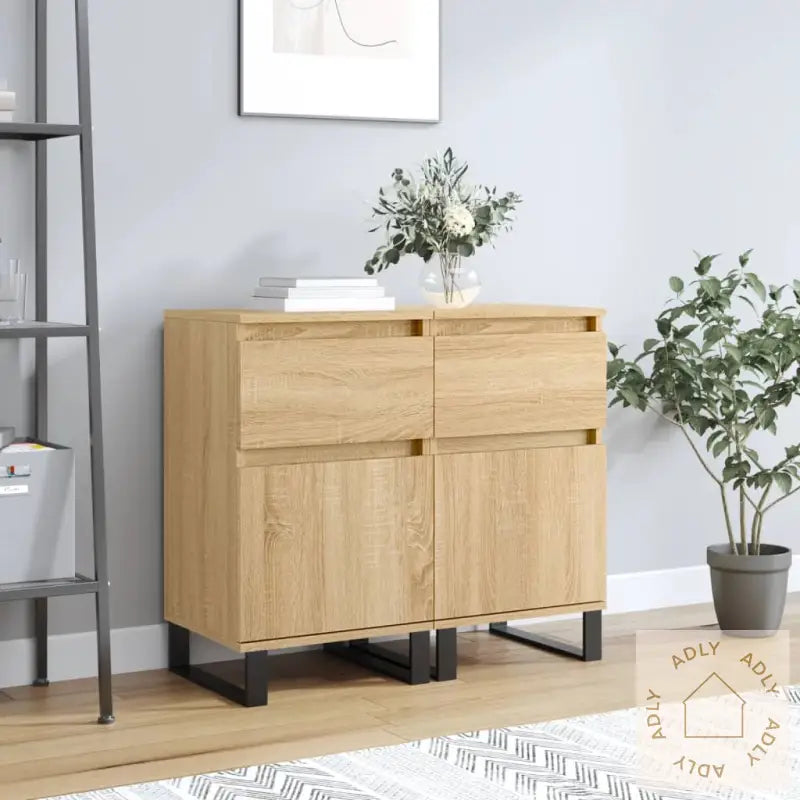 Skjenkene er laget av kvalitetskonstruert treverk i fargen sonoma eik, som både er slitesterkt, stabilt og motstandsdyktig mot fuktighet. Materialvalget gjør dem enkle å holde rene – det holder med en fuktig klut for å fjerne støv eller flekker.Med generøse oppbevaringsmuligheter sørger disse buffetskapene for at både hverdagsting og favorittgjenstander enklere holder seg ryddig organisert og lett tilgjengelig, uansett om du bruker dem på kjøkkenet, i gangen eller stua.Toppen av den moderne skjenken er ideell for å sette frem dekorative detaljer, rammer med familieøyeblikk eller potteplanter som gir rommet ditt et grønt løft. På denne måten føyer den seg naturlig inn sammen med andre møbler til hjemmet eller til og med blant visse typer hagemøbler under tak.Solide ben i jern gir ikke bare et røffere uttrykk, men også ekstra stabilitet og lang levetid.Advarsel: