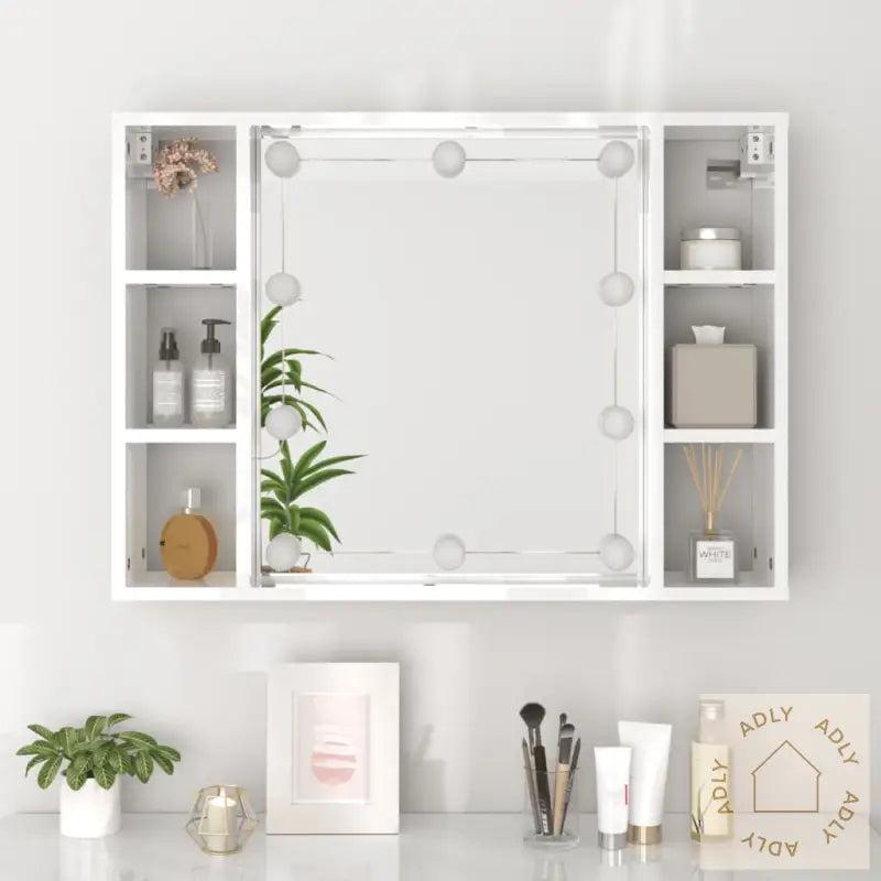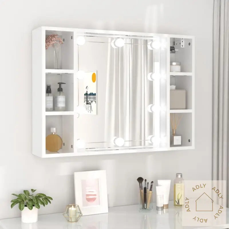 Skapet er laget av slitesterkt konstruert treverk av høy kvalitet med en glatt, blank overflate i høyglans hvit. Materialet gir styrke og stabilitet, og tåler også fuktighet slik at det egner seg godt på badet. Skapet er enkelt å rengjøre, noe som passer for travle hverdager.Det klare speilet gir deg god oversikt under sminkerutinen og setter et stilfullt preg på innredningen sammen med dine andre møbler. Speilfronten gjør også at rommet føles luftigere.LED-lysene gir jevn og effektiv belysning som hjelper deg med å legge perfekt sminke hver gang, eller gir ekstra lys når du ønsker det. USB-tilkoblingen gjør lading og bruk fleksibelt, så du slipper å lete etter stikkontakter.Med hele seks rom får du masse smart lagringsplass, så alt fra sminke og hudpleieprodukter til små håndklær og ekstra toalettsaker har sin faste, ryddige plass. Da blir det enkelt å holde orden blant hjemmets møbler!Skapets veggmonterte design gir deg ekstra gulvplass, slik at badet fremstår større og mer organisert. Perfekt der hver kvadratmeter teller – kombinér gjerne med hagemøbler eller utendørsmøbler for helhetlig stil i hjemmet og uterommet.Merk: