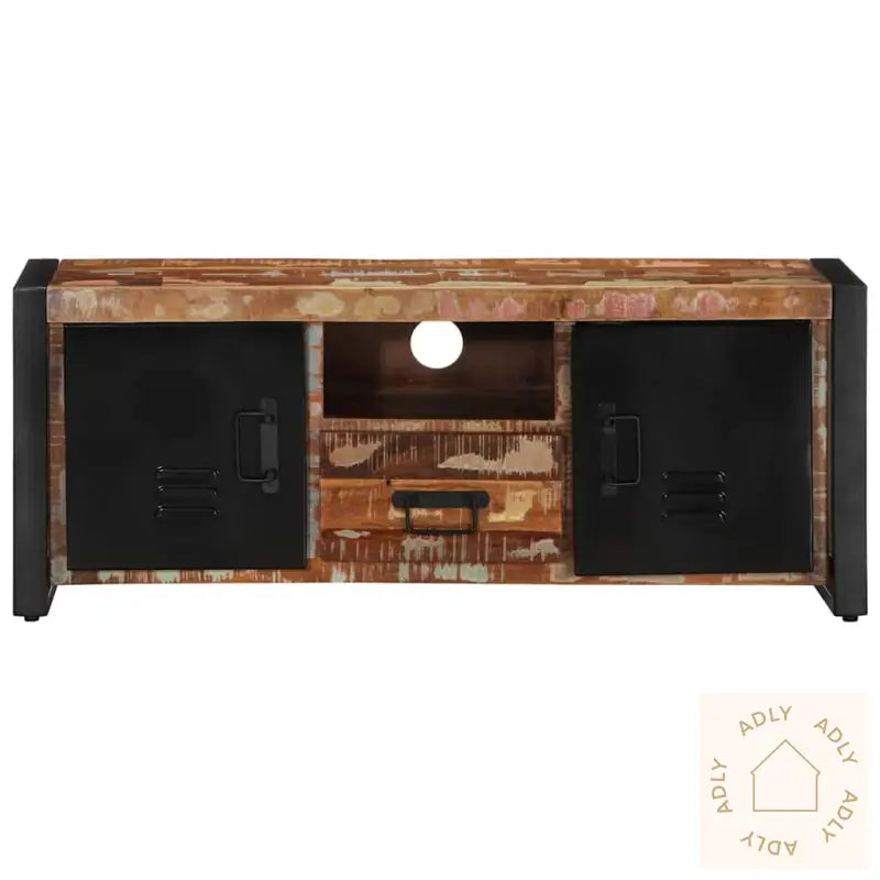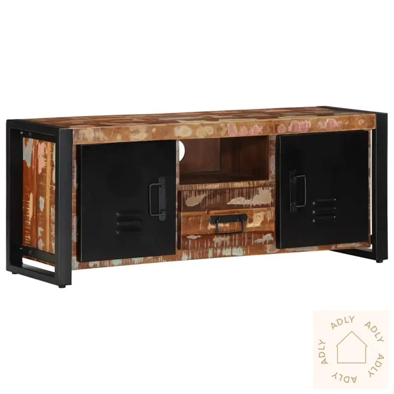Solid bordplate: Den stabile toppen gir god plass til både TV, stereoanlegg og pyntegjenstander som vaser eller potteplanter – perfekt for å fremheve din personlige stil i interiøret.Farger: svart og brunMaterialer: gjenvunnet heltre, jernMål: 100 x 30 x 40 cm (L x B x H)Med 2 dører, 1 hylle og 1 skuffMontering kreves: ja