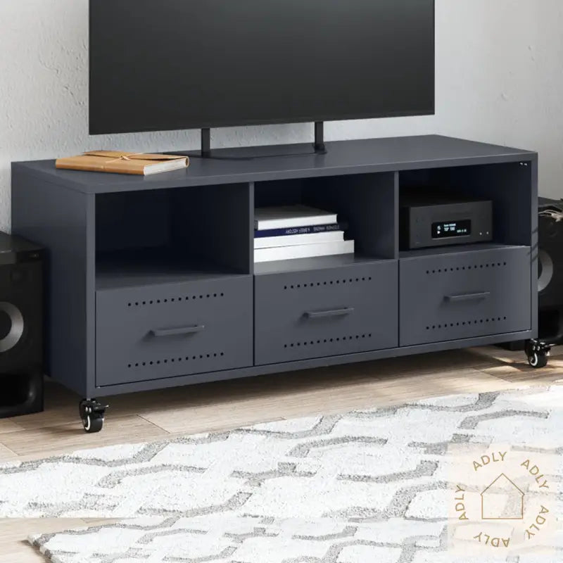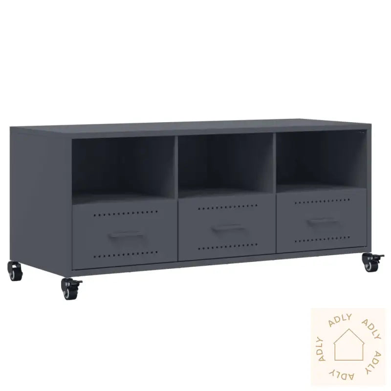 Slitesterkt materiale: Laget av kaldvalset stål gir denne benken eksepsjonell styrke, holdbarhet og stabilitet. Stålplater med høy overflatekvalitet sikrer et jevnt og stilig uttrykk, samtidig som møbelet holder formen over tid.Visningsfunksjon: Med en robust topp får du god plass til å fremheve dekorasjoner som fotorammer, planter eller små bokhyller og stående hyller – det gir rommet et personlig preg.Romslig oppbevaring: De tre skuffene og tre hyllene gir rikelig lagringsplass for ting som magasiner, DVD-er og ulike medierelaterte gjenstander, og hjelper deg å holde stua ryddig.Enkelt vedlikehold: Den flekkbestandige overflaten gjør rengjøring til en lek – tørk bare over med en fuktig klut for å holde møbelet pent og rent, som alt av kvalitetsmøbler bør være.Lett å flytte: Utstyrt med fire hjul kan TV-benken enkelt flyttes etter behov. Låsbare hjul gir sikker plassering uansett hvor du vil ha den i rommet.Farge: AntrasittMateriale: Kaldvalset stålMål: 100,5 x 39 x 43,5 cm (L x B x H)Montering kreves: Ja
