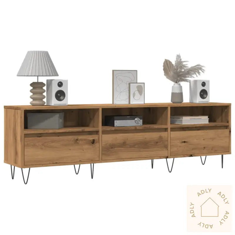Denne TV-benken i artisan eik gir stuen eller soverommet et moderne preg, samtidig som den byr på smarte lagringsmuligheter. Med sitt elegante design passer den godt inn sammen med andre møbler til hjemmet, for eksempel bokhyller og stående hyller, og bidrar til en gjennomført stil i rommet.