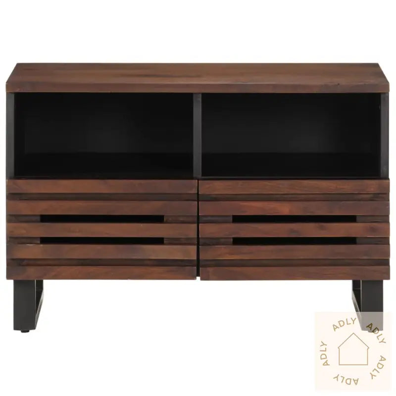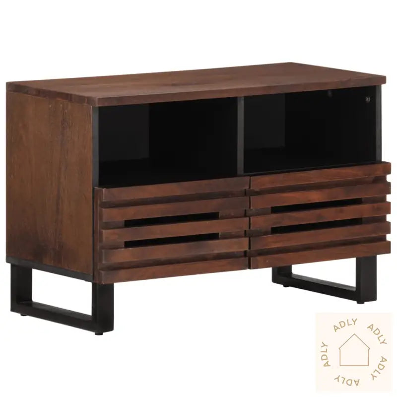 For å unngå at produktet velter, anbefales det å bruke den medfølgende festeanordningen når du monterer TV-benken. Dette gir ekstra sikkerhet, spesielt om du har små barn eller dyr hjemme.Farge: brunMateriale: heltre mangoMål: 70 x 34 x 46 cm (L x B x H)Med 2 skuffer og 2 romMontering kreves: ja