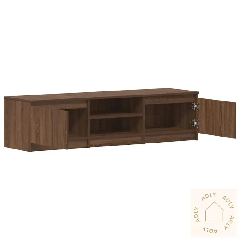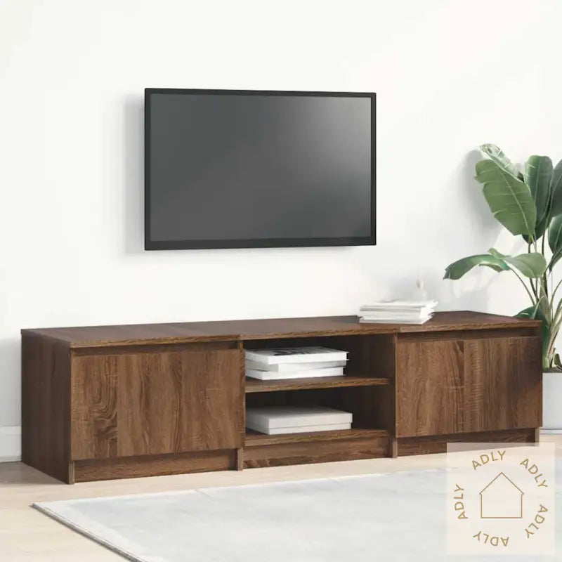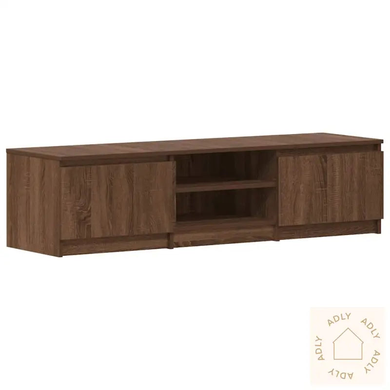 Praktisk materiale: Laget av konstruert tre av høy kvalitet, noe som gir deg en jevn og elegant overflate. Dette solide materialet gir ikke bare styrke og stabilitet, men motstår også fuktighet, og gjør det enkelt å vedlikeholde og holde rent over tid.Rikelig med lagringsplass: Du får godt med praktisk oppbevaringsplass bak dører og på hyllene, slik at du enkelt kan holde orden på alt fra elektronikk til bøker og tilbehør. Oppbevaringsløsningen gjør denne benken like nyttig i stua som sammen med andre bokhyller og stående hyller.Stilig utseende: De rette linjene og det tidløse designet sørger for at TV-enheten glir sømløst inn i interiøret, spesielt om du ønsker det gjennomførte uttrykket som brun eik gir. Fargen brun eik gir et varmt og naturlig preg, og lar seg lett kombinere med flere typer hagemøbler eller moderne stiler i hjemmet.Merk: