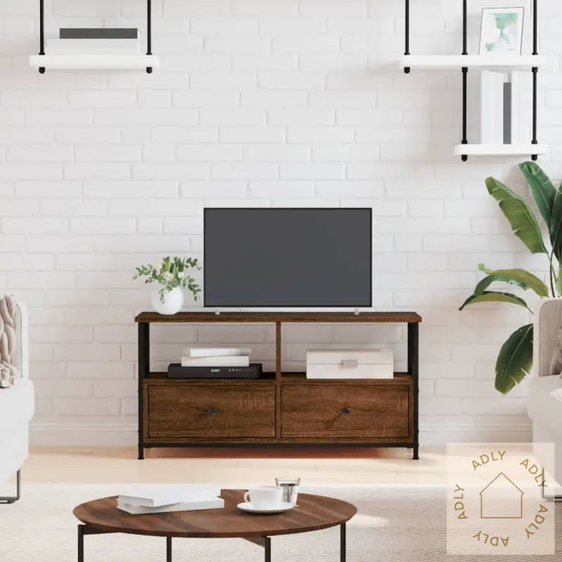 Solid materiale: TV-benken er laget av konstruert treverk som ikke bare har en glatt og pen overflate, men også utmerker seg med holdbarhet, styrke og fuktbestandighet. Vedlikeholdet er enkelt – det er bare å tørke av med en fuktig klut for å holde den ren.Rikelig med oppbevaringsplass: Med to åpne rom og to skuffer gir denne TV-enheten deg god plass til å organisere alt av DVD-spillere, spillkonsoller, strømmeenheter og annet medietilbehør. Du får dermed alt samlet og tilgjengelig uten at det ser rotete ut i stua.Robust topp: Den solide toppen på medieskapet passer perfekt for dekor, bøker eller andre pyntegjenstander du ønsker å vise frem, samtidig som TV-en står trygt.Farge: brun eik, som gir varme og karakter til rommetMaterialer: konstruert tre og jern gir robust konstruksjon og industrielt pregMål: 90 x 33 x 45 cm (B x D x H) – perfekt til både store og mindre hjemMontering kreves: ja