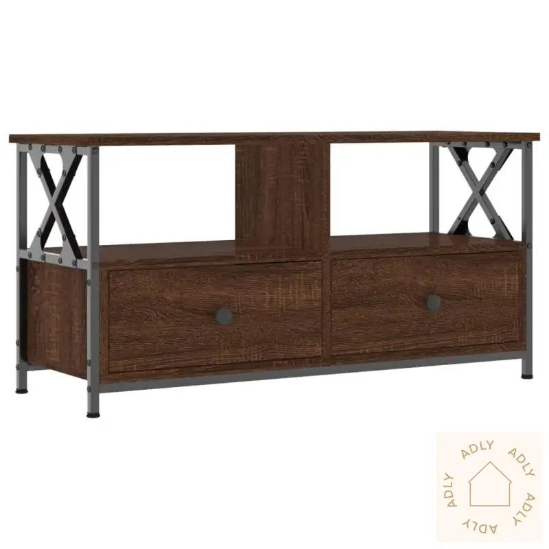 Denne industrielle TV-benken i brun eik er et praktisk og iøynefallende tillegg til møbler til hjemmet. Det stilige designet gjør at benken enkelt kan kombineres med andre møbler, enten det er moderne eller rustikt interiør.