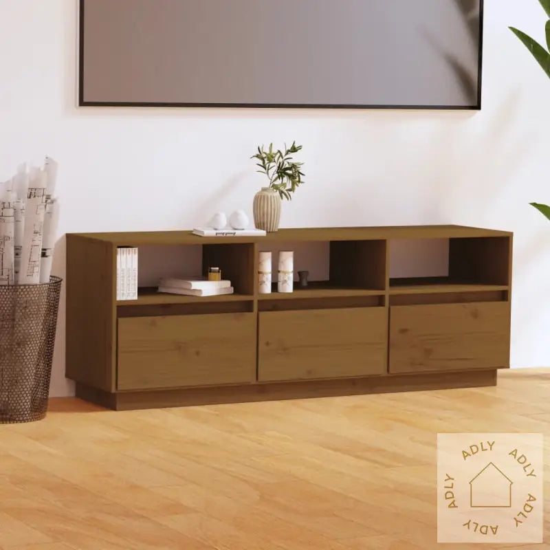Denne TV-benken i heltre furu gir et stilig og naturlig preg til stuen din, samtidig som den blir et blikkfang blant dine andre møbler til hjemmet. Benken har et tidløst design og er laget av slitesterkt, heltre furu, noe som sikrer lang levetid og stabilitet. Basen er smal, så du får et luftig uttrykk uten at kvaliteten kompromitteres. Stereoskapet har tre rom og tre skuffer som gir rikelig med oppbevaringsplass til DVD-er, spillkonsoller, magasiner og andre ting du ønsker å holde organisert og lett tilgjengelig. Den honningbrune finishen gir en varm og innbydende atmosfære til rommet. I tillegg er TV-stativet enkelt å vedlikeholde – det holder å tørke overflaten med en fuktig klut for å bevare den flotte looken år etter år. Velg en robust og funksjonell tv-benk i heltre furu for å komplettere interiøret ditt!