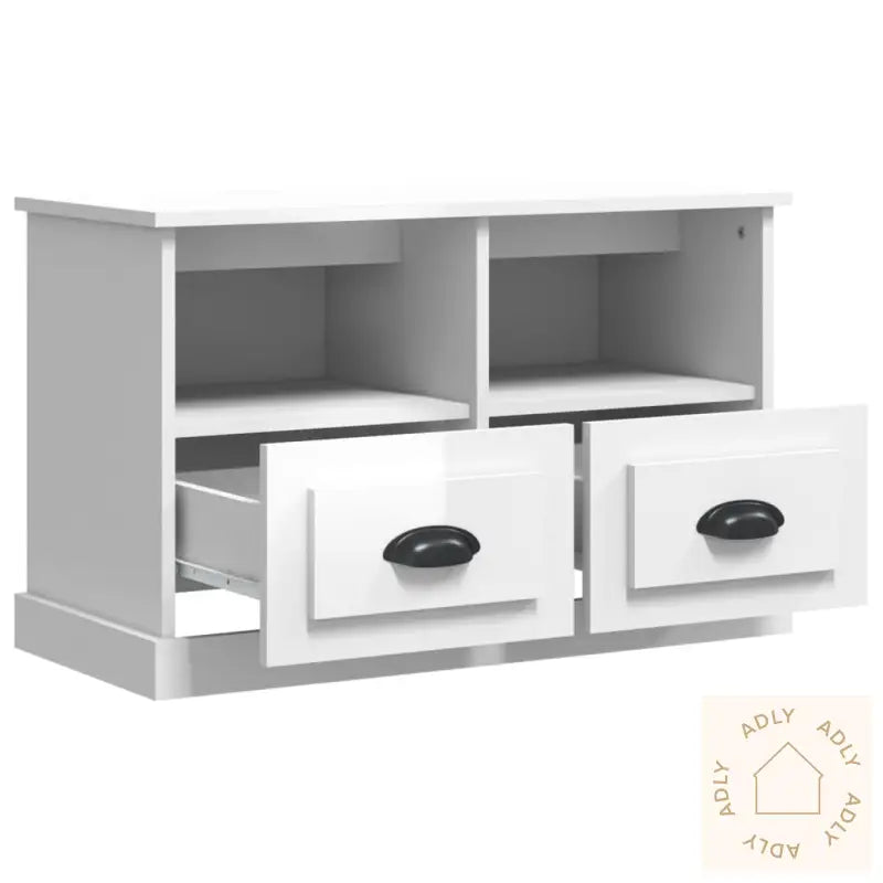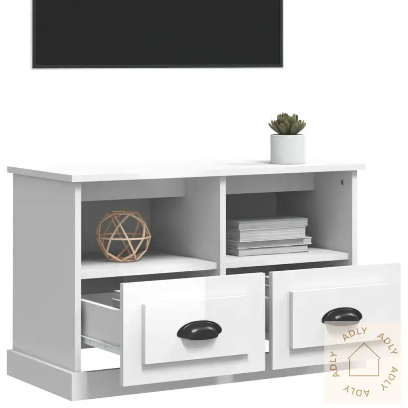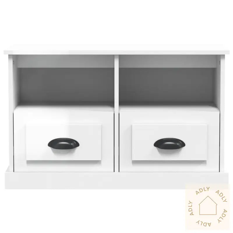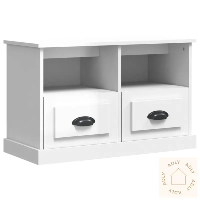 Slitesterkt materiale: Laget av høykvalitets konstruert tre med en glatt, hvit høyglans overflate. Dette gir ikke bare et pent uttrykk, men sørger også for at benken er robust, stabil og motstandsdyktig mot fuktighet – akkurat slik man ønsker seg av solide møbler som skal vare lenge.Rikelig lagringsplass: TV-benken har to romslige skuffer og to åpne hyller der du enkelt får plass til spillkonsoller, fjernkontroller, magasiner eller andre småting du ønsker å ha tilgjengelig og organisert. Perfekt for deg som vil ha orden og alt på sin plass.Visningsmuligheter: Den solide toppen av TV-benken gir god plass til å vise frem alt fra potteplanter og pyntegjenstander til innrammede bilder – gjør det personlig og la favorittene dine få sin plass i hverdagen. Kan også kombineres med bokhyller og stående hyller for å skape et helhetlig uttrykk i boligen.Advarsel: