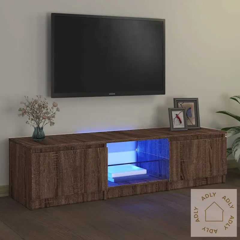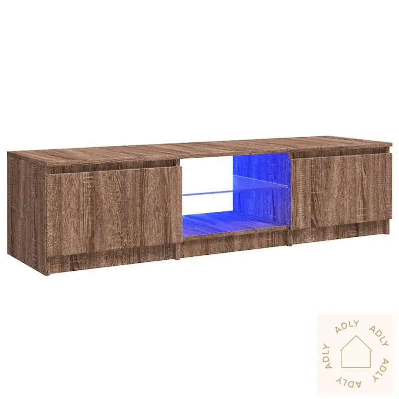 Denne TV-benken med RGB LED-lys kombinerer et stilig uttrykk med gode og praktiske løsninger – et smart valg blant moderne møbler til hjemmet. Det elegante designet, den varme brun eik-fargen og glassdetaljene gjør at benken enkelt blir et naturlig blikkfang i stua.
