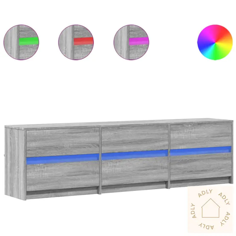 Stabilt og slitesterkt materiale: TV-benken er laget av konstruert tre, som ikke bare har en jevn og elegant overflate, men også er kjent for sin holdbarhet. Materialet tåler både fukt, vridning og sprekker, så du får et møbel som holder seg pent lenge og tåler daglig bruk.RGB LED-lys for stemningsfull belysning: LED-belysningen kan justeres etter humør og stil, slik at du enkelt kan bytte mellom ulike farger, lysstyrke og moduser. Det gir deg muligheten til å lage ditt eget lysshow og skape den perfekte atmosfæren i stuen – uansett anledning.God plass til oppbevaring: Med romslig oppbevaringsplass holder du orden på magasiner, bøker, DVD-er, fjernkontroller og multimedieenheter. Alt er lett tilgjengelig, og du unngår rot på TV-benken.Stødig og solid bordplate: Den solide toppen av TV-benken har en maksimal lastekapasitet på 40 kg, og tåler derfor både større TV-er, stereoanlegg eller flotte dekorasjoner som vaser og potteplanter – perfekt for deg som vil kombinere funksjon med personlig stil.Godt å vite: