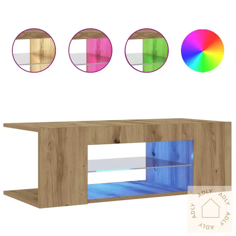 TV-benken leveres med USB-kontakt til LED-lysene, og krever en sertifisert 5V USV-strømkilde (ikke inkludert).Farge: artisan eikMateriale: konstruert treMål: 90 x 39 x 30 cm (B x D x H)Med 2 hyllerMontering kreves: ja