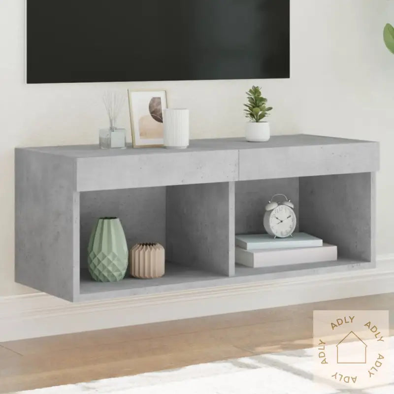 Husk at skruer og plugger ikke følger med til veggmontering. For best resultat bør du finne riktig type skruer og plugger til akkurat din vegg — spør gjerne en fagperson hvis du er usikker, og følg alltid instruksjonene nøye.TV-benken leveres med USB-tilkobling for LED-lysene, men krever en 5V USB-strømkilde (medfølger ikke). Sørg for at du bruker en sertifisert strømkilde for sikker bruk.Farge: betonggrå, som gir en rå og urban touch til stuaMateriale: konstruert treMål: 80 x 30 x 30 cm (L x B x H)Montering: Enkel montering kreves, alt du trenger følger med instruksjonene.