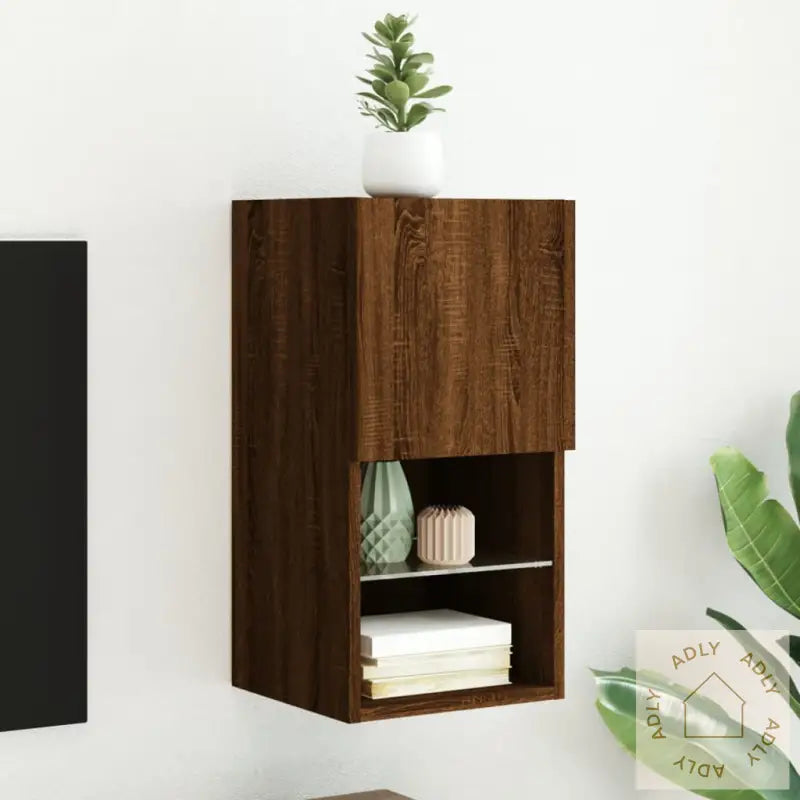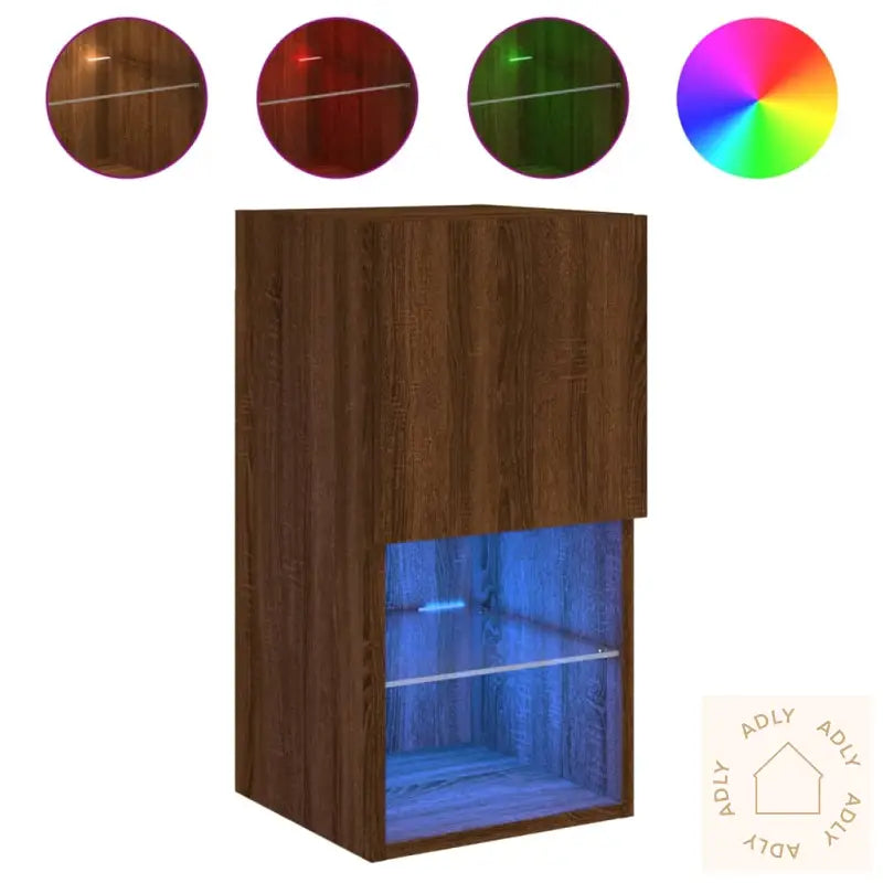 Skruer og plugger for veggmontering følger ikke med. For trygg og sikker montering anbefaler vi å bruke festemidler tilpasset akkurat dine vegger, og å spørre en fagperson hvis du er usikker. Følg monteringsveiledningen nøye for best resultat.TV-benken har en USB-kontakt for LED-lysene. Her trenger du en sertifisert 5V USB-strømkilde (ikke inkludert) for å få full glede av RGB LED-lys-funksjonen.Farge: brun eik – en varm og tidløs nyanse som tilfører hjemmet ditt et naturlig preg og matcher mange andre hagemøbler og interiørstiler.Materialer: konstruert tre og glass gir en solid, men elegant følelse.Mål: 30,5 x 30 x 60 cm (L x B x H) – kompakte mål gjør at benken passer selv der plassen er begrenset.Montering kreves: ja