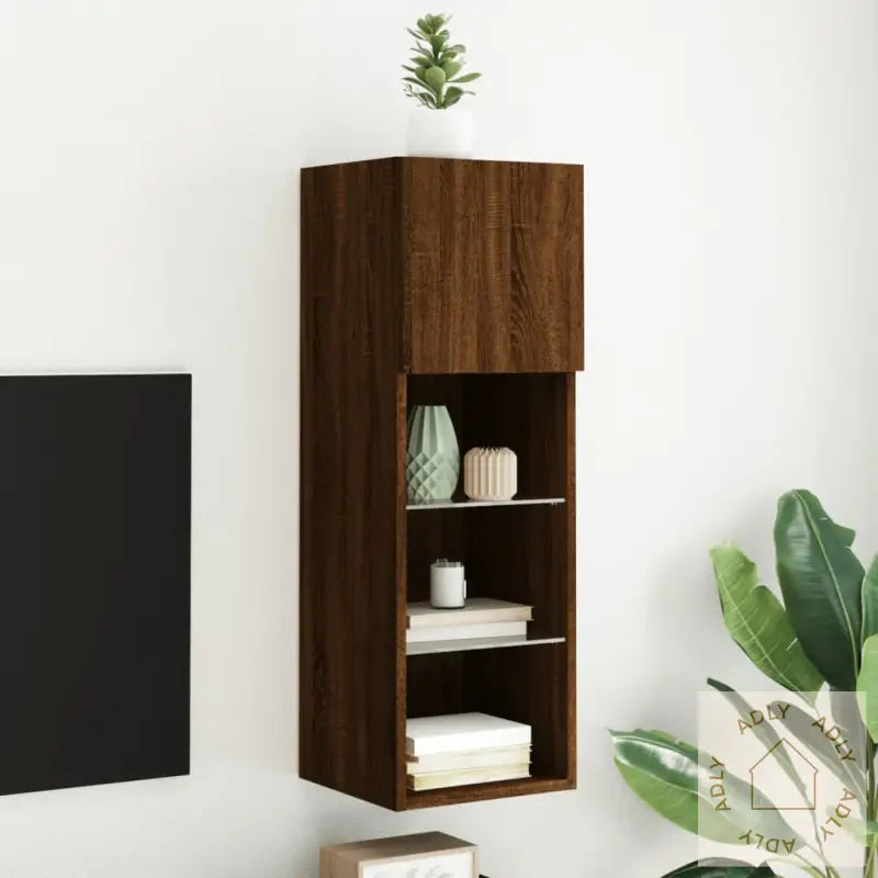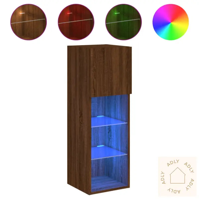 TV-benken er produsert i konstruert tre med brun eik-finish, noe som gir en slitesterk overflate som både ser flott ut og tåler daglig bruk. Overflaten er jevn og enkel å holde ren. Materialvalget gir god stabilitet, tåler litt fuktighet, og sørger for at benken holder lenge.Praktisk oppbevaringsplass gir deg mulighet til å organisere alt fra DVD-spillere og spillkonsoller, til fjernkontroller og diverse interiørdetaljer. Skapene og hyllene gjør det enkelt å holde stua ryddig, med alt samlet på ett sted og lett tilgjengelig.De innebygde RGB LED-lysene lar deg velge mellom ulike farger og lysinnstillinger slik at du kan tilpasse stemningen og skape akkurat den atmosfæren du ønsker – perfekt for filmkveld eller gaming. Fargeskift-funksjonen gir en ekstra kul effekt, spesielt på kveldstid.Vegghengt design sparer gulvplass og gir et rent, minimalistisk uttrykk, samtidig som det gjør det ekstra lett å rengjøre under møbelet. Skapet kan enkelt monteres på veggen slik at du får frigjort rommet for annen innredning eller hagemøbler hvis du har kombinert stue og utemiljø.Godt å vite: