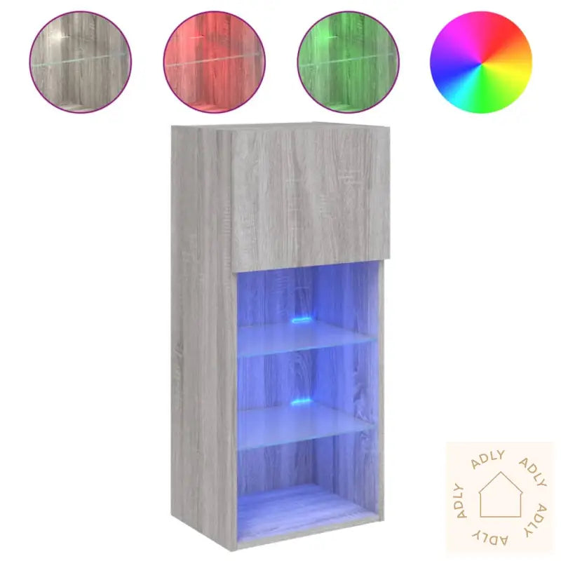 - RGB LED-lys: Det innebygde RGB LED-lyset gir stemningsfull belysning til stua og lar deg velge mellom ulike farger eller la automatisk skifte gå sømløst fra en farge til en annen. Dette skaper ekstra visuell effekt og gjør TV-benken til et sentralt element blant dine møbler.