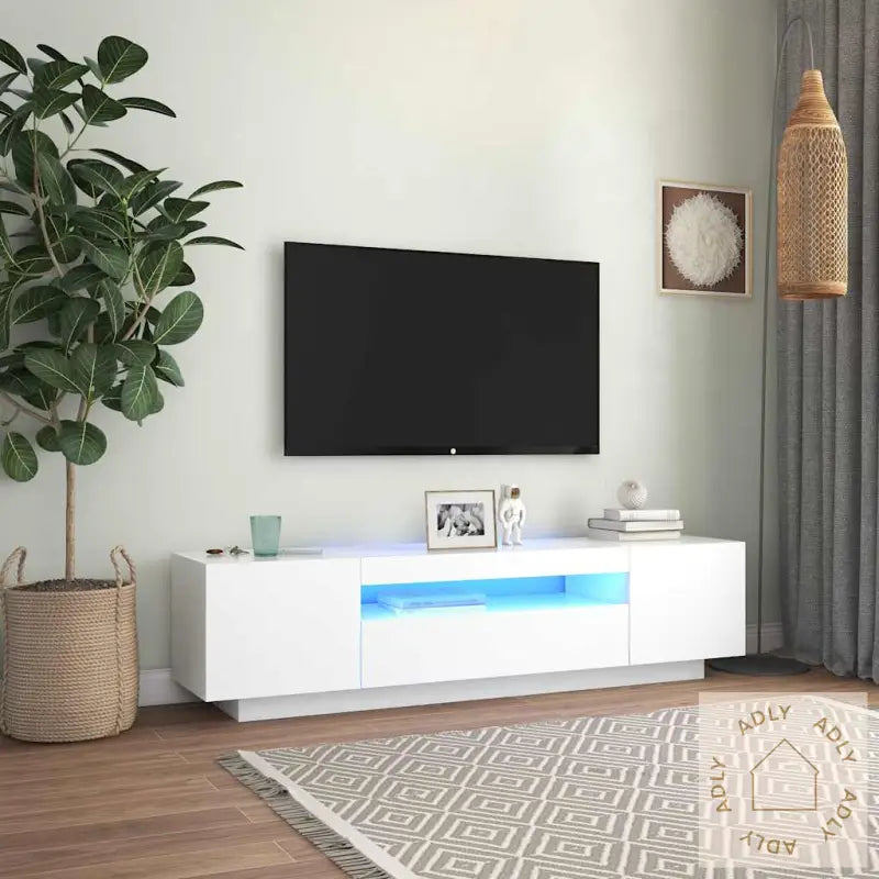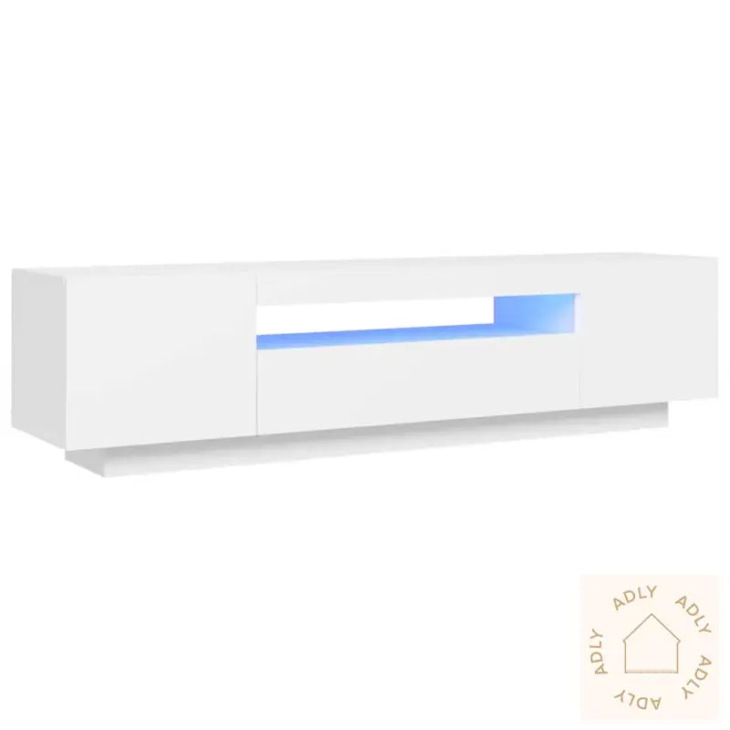 Denne TV-benken med led lys kombinerer et moderne, stilig utseende med praktisk funksjonalitet og blir garantert et naturlig blikkfang blant dine møbler til hjemmet. Den solide konstruksjonen i konstruert tre gir god stabilitet og lang holdbarhet.