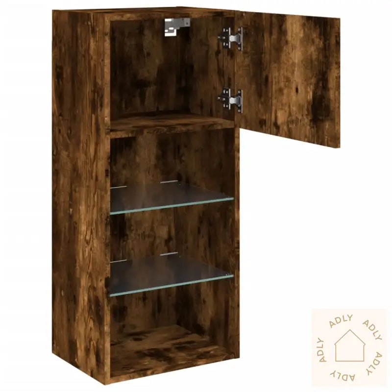 Skruer og plugger for veggmontering følger ikke med. Velg skruer og plugger som egner seg til akkurat dine vegger, gjerne etter råd fra fagfolk. Følg monteringsanvisningen nøye for best mulig resultat.Produktet har USB-kontakt til LED-lysene og krever en sertifisert 5V USB-strømkilde (må kjøpes separat).Farge: Røkt eikMaterialer: Konstruert tre og glassMål: 40,5 x 30 x 90 cm (L x B x H)Montering kreves: Ja
