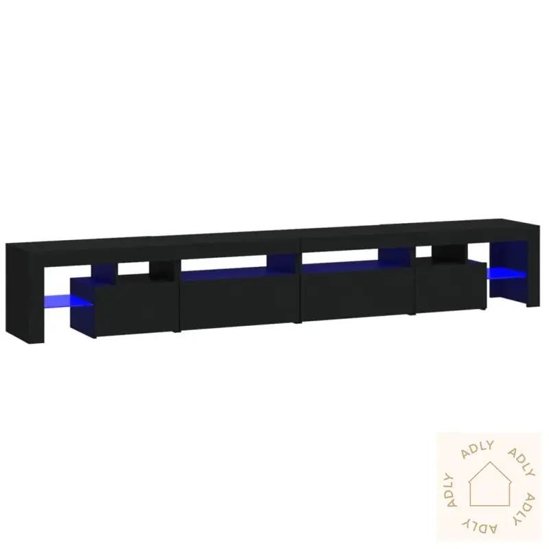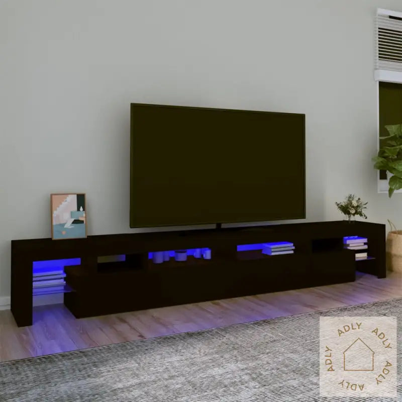 Praktisk materiale: Den er laget av førsteklasses konstruert treverk som ikke bare har en glatt overflate, men også er kjent for å være sterk, stabil og motstandsdyktig mot fuktighet. Disse kvalitetene sørger for at møbelet holder seg flott og funksjonelt i lang tid.Fargerike LED-lys: Med innebygde RGB LED-lys får du flere alternativer for belysning. Du kan velge mellom ulike fargemenyer, slik at du enkelt kan tilpasse lyset etter stemning eller interiør. Lyset understreker de moderne linjene, løfter atmosfæren og gir rommet et ekstra løft, perfekt for kvelder med film eller gaming.Rikelig med lagringsplass: Du får god plass til å holde alt fra magasiner og fjernkontroller til bøker og andre småting ryddig og lett tilgjengelig. Det gir en enklere og mer organisert hverdag, samtidig som det bidrar til et minimalistisk uttrykk.Visningsfunksjon: Den solide topplaten passer ypperlig til pynt som fotoplakater, planter eller andre dekorative elementer som gir personlig karakter til innredningen din. Slik blir TV-benken ikke bare praktisk, men også en del av hjemmets stilfulle helhet.Merk: