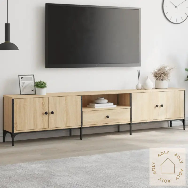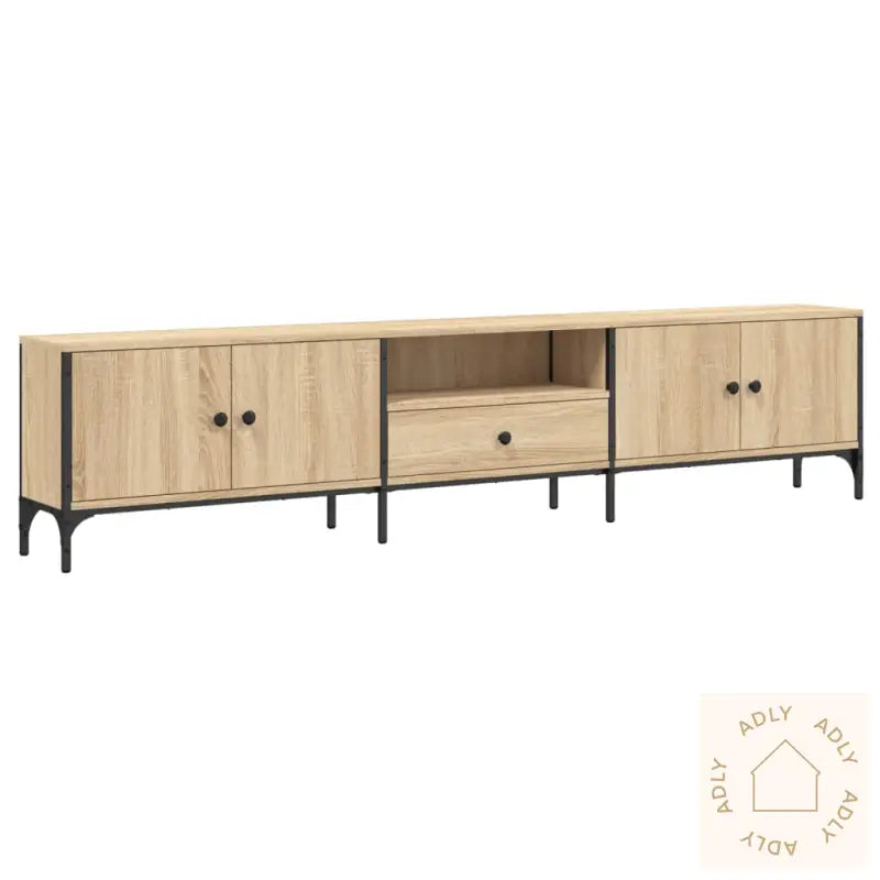 TV-benken er laget av konstruert tre av høy kvalitet med en glatt og slitesterk overflate. Dette materialet gjør møbelet både solid og stabilt, i tillegg til at det gir god motstand mot fukt – akkurat det du ønsker fra funksjonelle møbler til hjemmet. Den robuste metallrammen gir ekstra styrke og lang holdbarhet, så benken holder seg fin lenge.I det romslige medieskapet får du masse plass til magasiner, bøker, spill, DVD-er eller andre småting. Oppbevaringsplassen lar deg holde orden i stua, så alt er lett tilgjengelig når du trenger det.Den solide toppen på HiFi-skapet tåler hverdagens bruk og fungerer perfekt til å sette frem pynt, bilder, potteplanter eller favorittdekorasjonene dine – slik at TV-benken enkelt blir en del av helheten sammen med resten av møblene.Justerbare føtter med plastputer gir sikker støtte og sørger for at TV-benken står stødig selv på litt ujevne gulv. Det betyr at medieskapet alltid er balansert og trygt, uansett hvor du plasserer det.Bak praktiske dører kan du skjule nips, teknisk utstyr eller viktige småting du helst vil ha unna synet – samtidig som de beskyttes mot støv. Alt ligger organisert, men likevel lett tilgjengelig bak dørene til TV-konsollen.Farge: Sonoma eikMaterialer: konstruert tre, metallMål: 200 x 25 x 44 cm (L x B x H) – et stilrent og praktisk tilskudd enten du ser etter nye møbler til hjemmet eller bare ønsker å oppdatere stuenMaks lastekapasitet per hylle: 20 kg – plass til det meste du bruker ved TV-enMontering kreves: ja, men det er enkelt å sette sammen