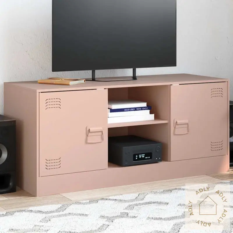 Stabilt materiale: Rammen til denne TV-benken er laget av kaldvalset stål, kjent for sin styrke, jevne overflate og presise kvalitet. Med kaldvalset stål får du en robust konstrukson som både tåler daglig bruk og beholder utseendet lenge, noe som gir ekstra verdi når du investerer i møbler til hjemmet.Rikelig med lagringsplass: Skapet gir deg rikelig med smart oppbevaring for magasiner, bøker, fjernkontroller og annet tilbehør. Du får alltid tingene dine lett tilgjengelig og samtidig skjult for et ryddig uttrykk.Enkelt å vedlikeholde: Bordplaten og overflaten er veldig enkel å holde ren – en fuktig klut er alt som trengs. Materialvalget sikrer at TV-benken krever minimalt vedlikehold og forblir pen over tid.Praktisk håndtak: TV-benken er utstyrt med 2 solide metallhåndtak som gjør det enkelt å åpne og lukke dørene. Håndtakene gir samtidig en stilig detalj og understreker det moderne designet.Farge: rosaMateriale: kaldvalset stålMål: 99 x 39 x 44 cm (B x D x H)Egnet størrelse TV-skjerm: 51-76 cmMaksimal lastekapasitet: 90 kgMed 2 hyller2 rom med dørerMed 2 metallhåndtakMontering kreves: ja