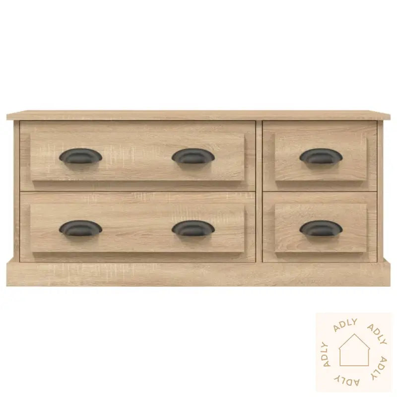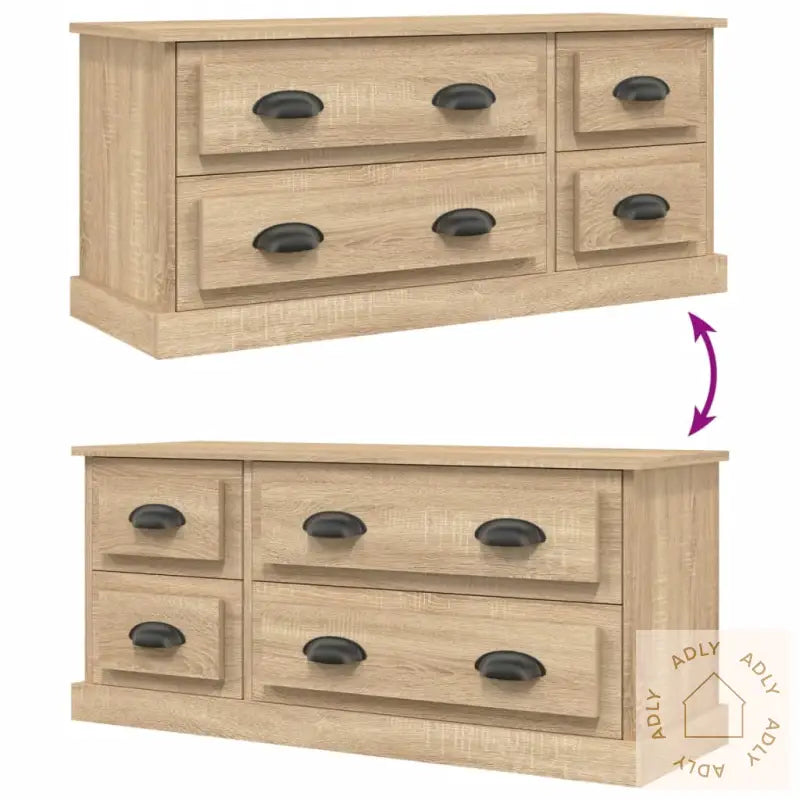 Slitesterkt materiale: Produsert i konstruert tre av høy kvalitet, noe som gir benken en jevn og fin overflate, samt sikrer styrke, stabilitet og god motstand mot fuktighet. Dette gjør det til et smart valg når du vil investere i møbler til hjemmet som varer lenge.Rikelig lagringsplass: Med 4 romslige skuffer har du god lagringsplass til magasiner, DVD-er, kabler eller andre småting du gjerne vil ha tilgjengelig, men ute av syne. Alt holder seg ryddig og oversiktlig.Robust bordplate: Overflaten på TV-benken er robust og stødig – et ideelt sted for dekor, favorittbildene dine eller en trendy potteplante. Perfekt også for TV-en og annen underholdningselektronikk.Fleksibel montering: Skuffene kan monteres enten til venstre eller høyre, slik at du kan tilpasse TV-benken etter akkurat dine behov og hvordan stuemøblene dine ellers er plassert.Denne TV-benken kombinerer stilig utseende med praktiske funksjoner – et smart tilskudd til alle som leter etter solide og allsidige møbler.