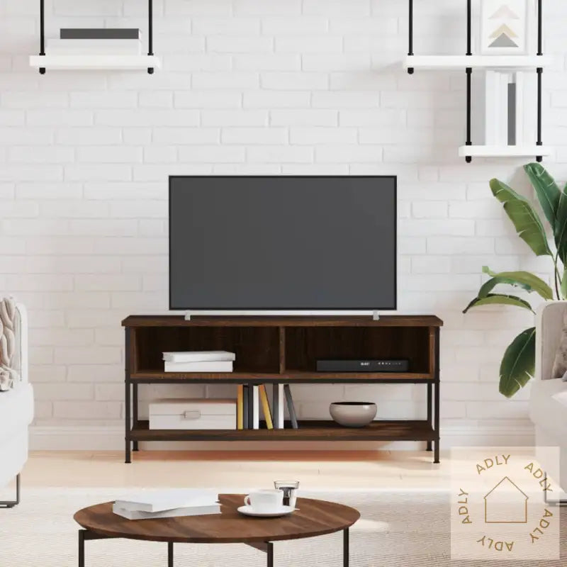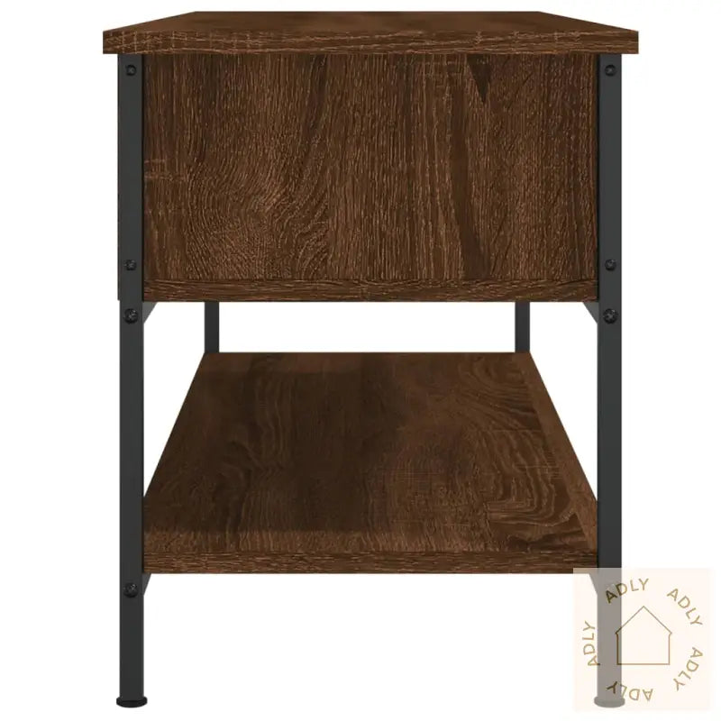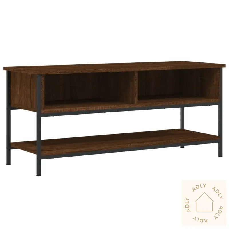 Slitesterkt materiale: Det konstruerte treverket sørger ikke bare for et elegant utseende, det er også robust, stabilt og motstandsdyktig mot fuktighet. Dette gir lang levetid og gjør at møbelet tåler daglig bruk – supert for travle hjem eller som et pålitelig supplement til dine øvrige bokhyller og stående hyller.Rikelig med lagringsplass: Med 2 åpne rom og en ekstra hylle får du rikelig plass til å oppbevare og organisere alt fra DVD-spillere og spillkonsoller til strømmeenheter og andre mediebærere. Alt er enkelt å finne fram til, og du holder det ryddig og oversiktlig rundt TV-området.Jernføtter: TV-benken står stødig på jernføtter, noe som gir hele møbelet en tøff, industriell touch samtidig som det sikrer stabilitet. Dette matcher også perfekt sammen med andre moderne møbler til hjemmet.Visningsfunksjon: Toppen av TV-benken er solid og bred nok til at du kan vise frem dekorative detaljer du er glad i, som fotorammer, planter eller små pyntegjenstander. Slik får du muligheten til å gjøre stua din mer personlig og unik med denne benken kombinert med andre stilige møbler og hagemøbler.Farge: brun eikMaterialer: konstruert tre, jernMål: 100 x 35 x 45 cm (B x D x H)Montering kreves: ja