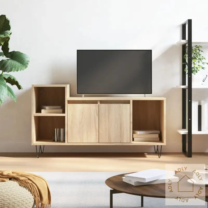 Med et stilig, men praktisk design vil denne TV-benken i sonoma eik bli et naturlig samlingspunkt i stua. Dette møbelet kombinerer moderne estetikk med funksjonalitet, og passer perfekt sammen med andre møbler til hjemmet som bokhyller og stående hyller.