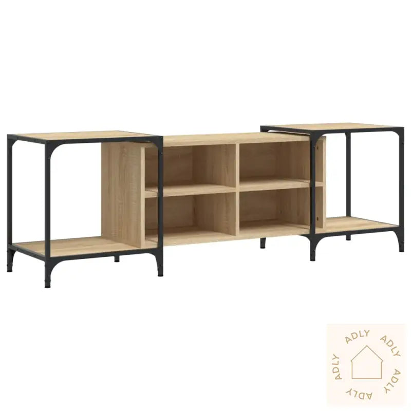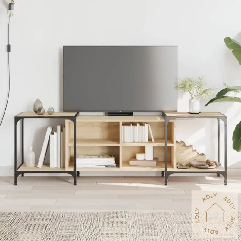 Slitesterkt materiale: Skapet er laget av konstruert tre av høy kvalitet, noe som gir styrke, stabilitet og god motstand mot fuktighet – perfekt for deg som ønsker holdbare møbler du enkelt kan tørke av og holde pene over tid.Rikelig oppbevaringsplass: Hyllene gir god plass til å organisere alt fra spillkonsoller og fjernkontroller til bøker og rutere. Du får enkel tilgang til det viktigste, samtidig som det blir lettere å holde stua ryddig.Justerbar design: Du kan justere bredden på denne TV-konsollen etter hva som passer best hjemme hos deg. De justerbare føttene med plastputer sikrer at medieskapet alltid står stødig, selv på litt ujevne gulvflater.Visningsmuligheter: Den solide topplaten i sonoma eik gir deg et naturlig blikkfang, perfekt for favorittplantene dine, bilder eller andre dekorative detaljer som gjør møblet personlig og hyggelig.Metallramme: En solid metallramme gir møblet ekstra styrke og bidrar til et industrielt preg i rommet. Dette gir god støtte for alt utstyret ditt, samtidig som TV-benken får et moderne uttrykk.Advarsel:
