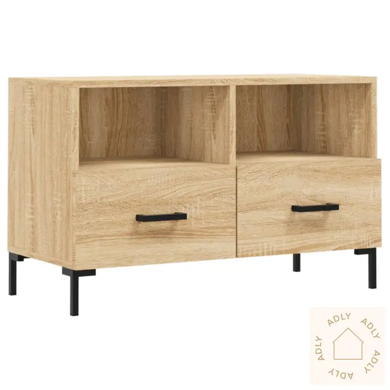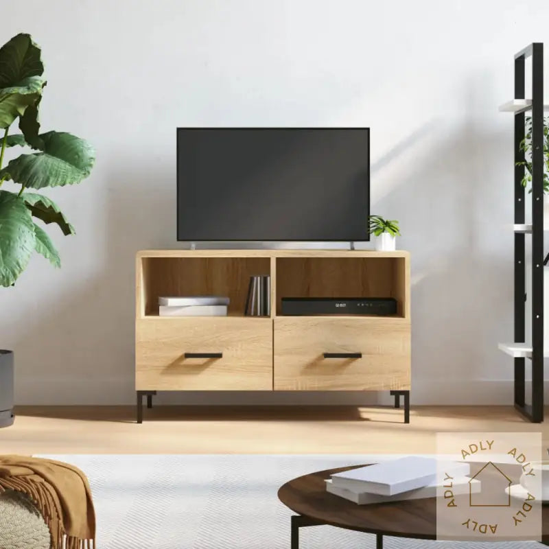 Solid materiale: Benken er laget av konstruert tre av høy kvalitet med en glatt overflate som er enkel å holde ren. Materialet er ikke bare slitesterkt og stabilt, men har også utmerket motstand mot fukt, noe som gjør denne TV-benken perfekt for daglig bruk i ethvert hjem.Romslig oppbevaring: Med to åpne rom og to praktiske skuffer får du god plass til å organisere alt fra magasiner og fjernkontroller til DVD-er og småelektronikk. Oppbevaringsløsningen gjør det enklere å holde stuen ryddig og oversiktlig – et viktig poeng når man ønsker møbler til hjemmet som kombinerer design og funksjon.Visningsfunksjon: Den solide toppen gir deg mulighet til å vise frem favorittdekorasjoner, fotorammer, planter eller andre personlige ting – perfekt for å gjøre hjemmet mer personlig og innbydende.Jernben: Jernben gir denne TV-benken i sonoma eik ekstra karakter og et moderne uttrykk, samtidig som de sørger for at møbelet står stødig og sikkert. Dette gir tilleggspoeng for deg som ønsker robuste, men samtidig stilige hjemmemøbler.Advarsel: