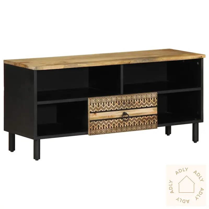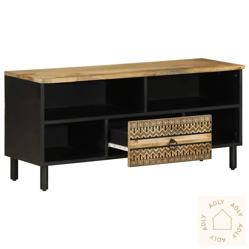 Robust og stabilt materiale: Benken er laget av grovt heltre mangotre, et massivt tropisk løvtre verdsatt for sin eksepsjonelle styrke, bærekraft og levetid. Hvert møbel har unike, vakre trekorn og naturlige fargevariasjoner, noe som gir deg et helt særegent produkt. Dette betyr at ingen TV-benker er helt like, og du får et møbel med ekte karakter.Rikelig med oppbevaringsplass: TV-benken har en praktisk skuff og to hyller, slik at du enkelt kan oppbevare magasiner, bøker, DVD-er, fjernkontroller og andre småting samlet og ryddig. De åpne hyllene gjør det enkelt å organisere alt du gjerne vil ha lett tilgjengelig, samtidig som du holder overflaten fri for rot.Med ben: De solide jernbena gir ikke bare et moderne preg, men gjør det også enklere å rengjøre under benken og sørger for god luftstrøm rundt elektronikken. Dette forlenger levetiden til elektriske apparater og gjør renholdet mye enklere i hverdagen.Enkel å vedlikeholde: Den slitesterke overflaten på heltre mangotre gjør det raskt å tørke av støv og smuss med en fuktig klut, så du slipper omfattende vedlikehold. Det gir deg mer tid til å bruke og glede deg over møbelet.Godt å vite: