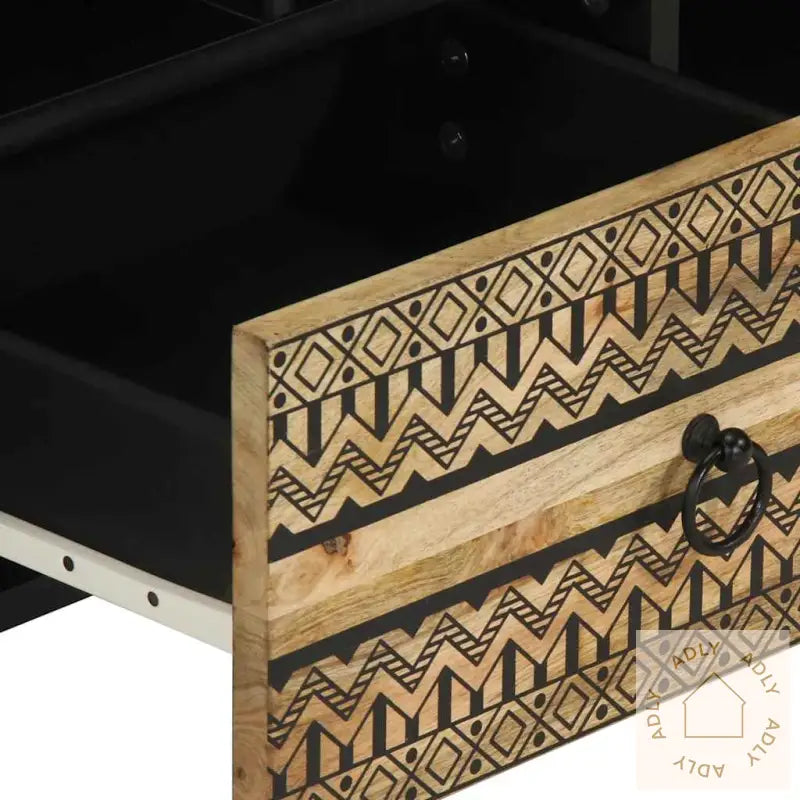 Hver gjenstand i grovt heltre mangotre er helt unik, med sitt eget særpreg i både farge og åremønster. Produktet leveres derfor med tilfeldig kornstruktur og fargevariasjoner, noe som virkelig fremhever den personlige og eksklusive følelsen du får av ekte heltre mangotre.Farge: svartMaterialer: grovt heltre mangotre, jernMål: 100 x 33,5 x 46 cm (L x B x H)Høyde ben: 10 cmMed 1 skuff og 2 hyllerMontering kreves: ja