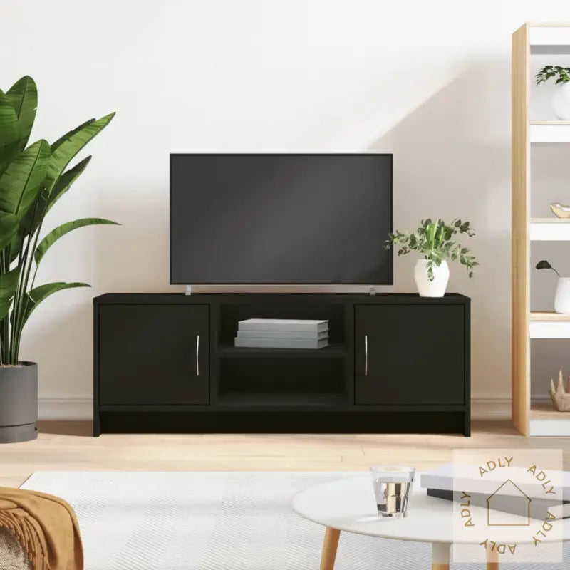 Slitesterkt materiale: Benken er laget av konstruert tre av høy kvalitet, noe som gir en robust konstruksjon med glatt overflate, høy stabilitet og god motstand mot fukt. Perfekt for deg som vil ha møbler som varer lenge!Rikelig med lagringsplass: Denne TV-benken kommer med fire romslige oppbevaringsrom, slik at du enkelt kan organisere bøker, magasiner, DVD-er eller annet tilbehør – akkurat som i smarte bokhyller og stående hyller. Her holder du stua ryddig og får alt på plass.Robust bordplate: Toppen gir en solid overflate som tåler både flatskjerm, pynt, bilder eller grønne planter. Utstill favorittdekorasjonene dine og sett et personlig preg på rommet.Praktiske dører: Skapet har hendige dører slik at du kan skjule de nødvendighetene du ikke vil ha fremme, og samtidig beskytte dem mot støv. Dette gjør TV-benken enda mer funksjonell og holder tingene dine pene og rene.Farge: svartMateriale: konstruert treMål: 102 x 30 x 37,5 cm (B x D x H)Montering kreves: ja